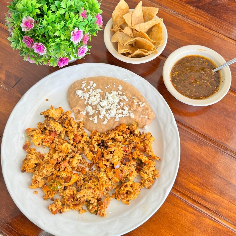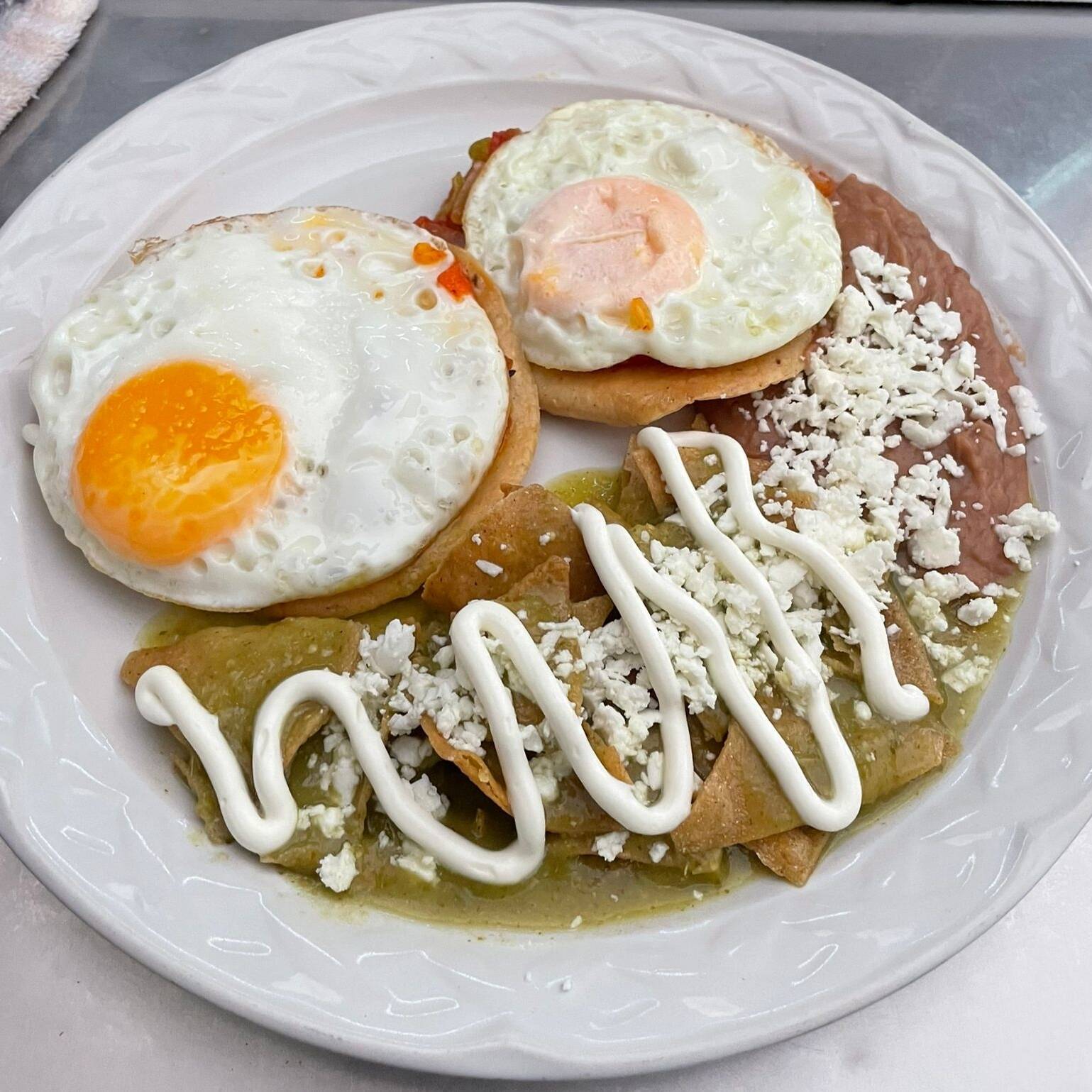 Una genrosa porcion de crujientes totopos bañados en una salsa a tu eleccion, acompañados con 2 huevos al gusto y con frijoles refritos, finalizar se coronan con crema y queso.