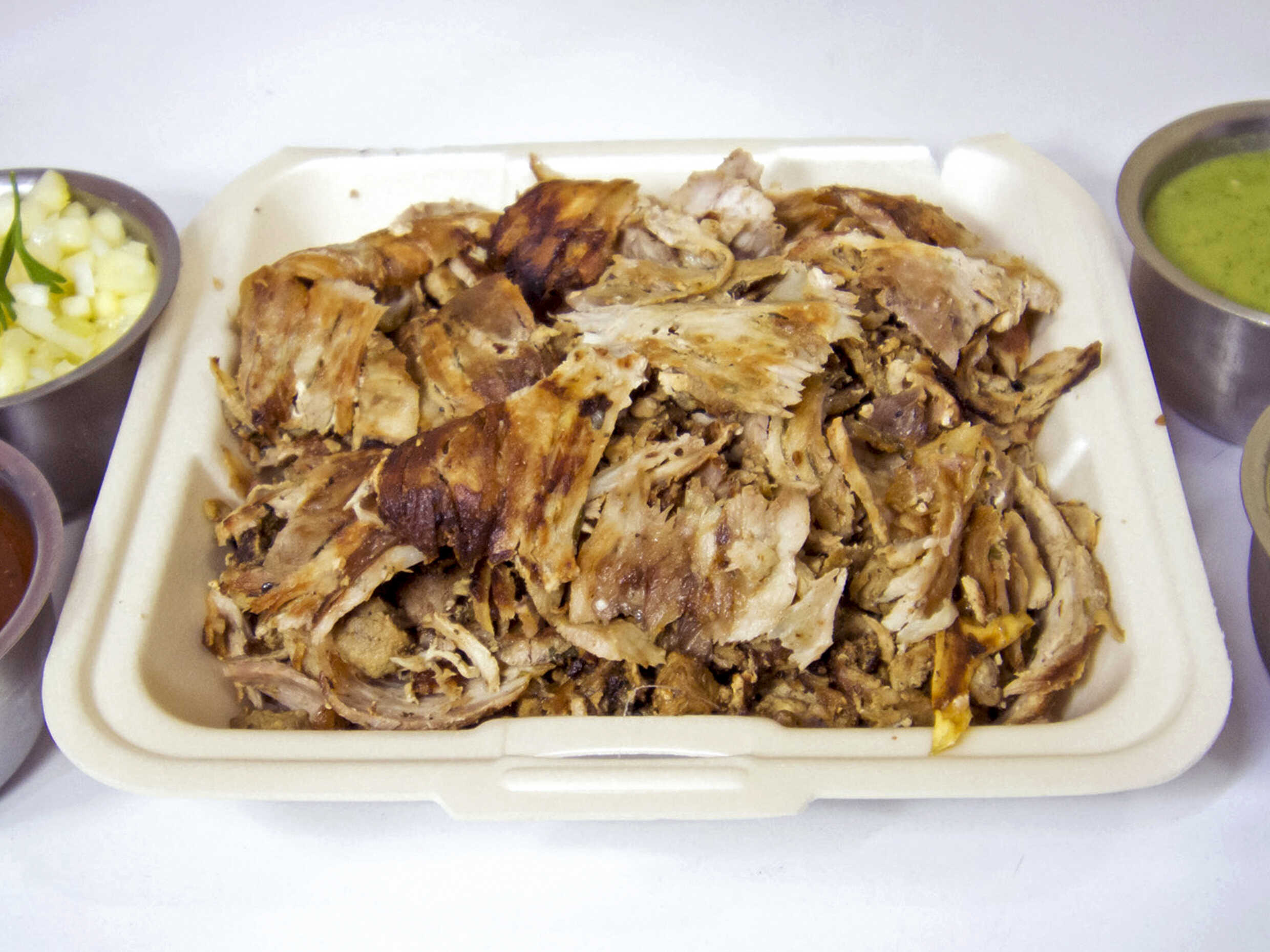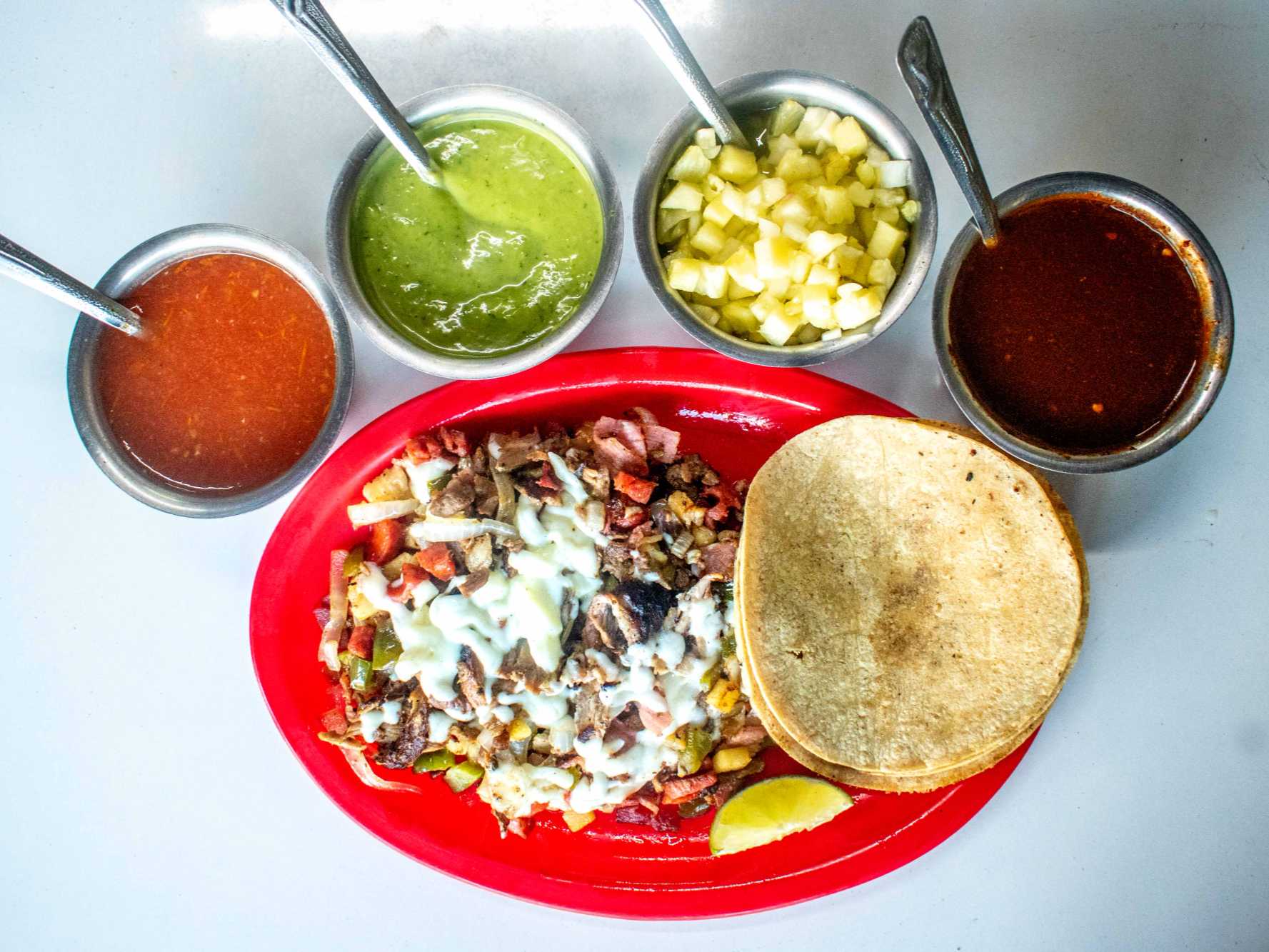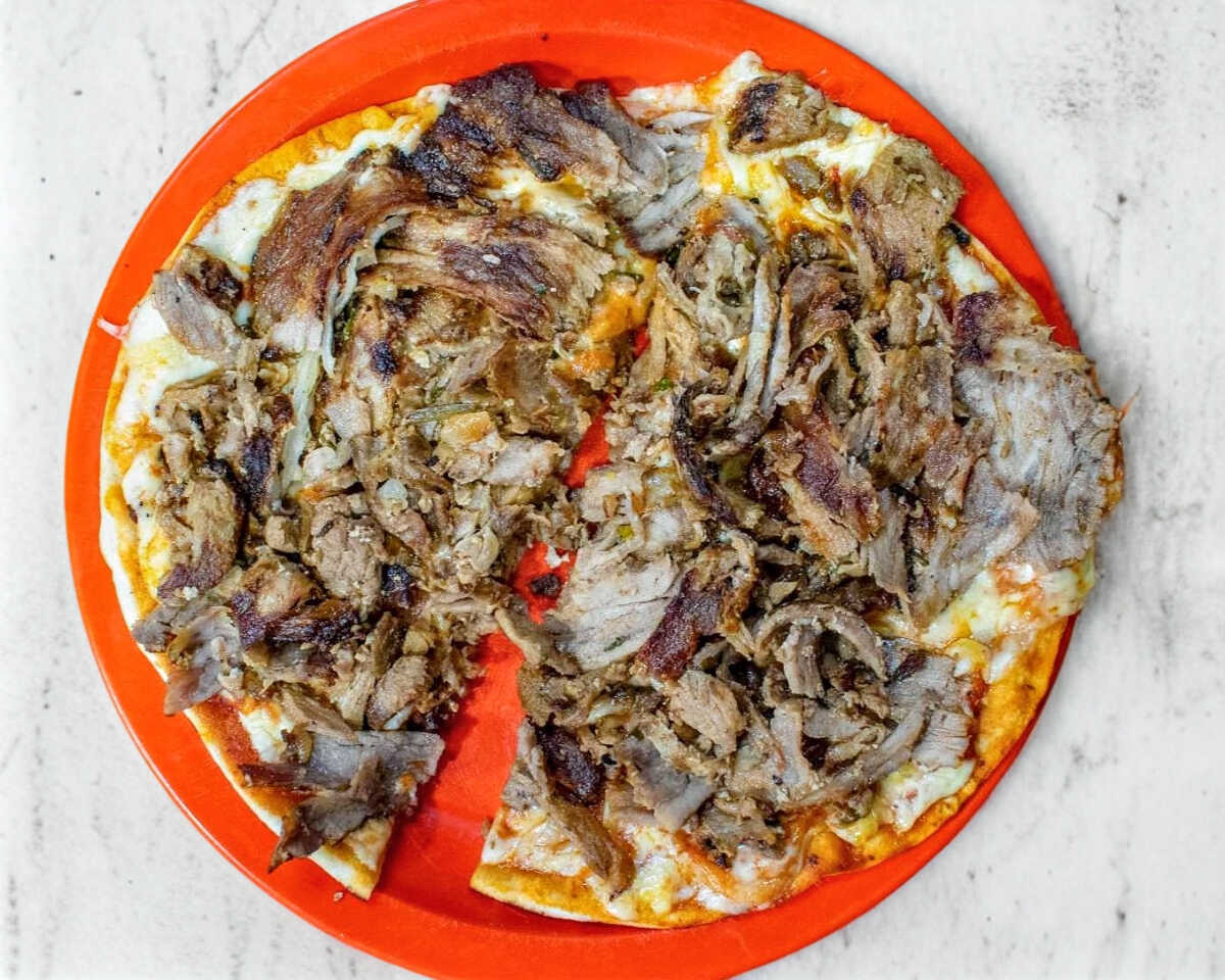 Carne árabe, combinada con bistec, chorizo, tocino, cebolla, morrón y queso gratinado, acompañado de tortillas de maíz. Porción de 230 gramos.