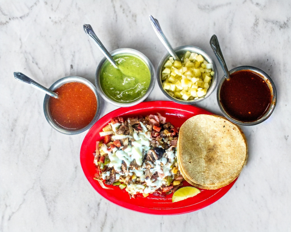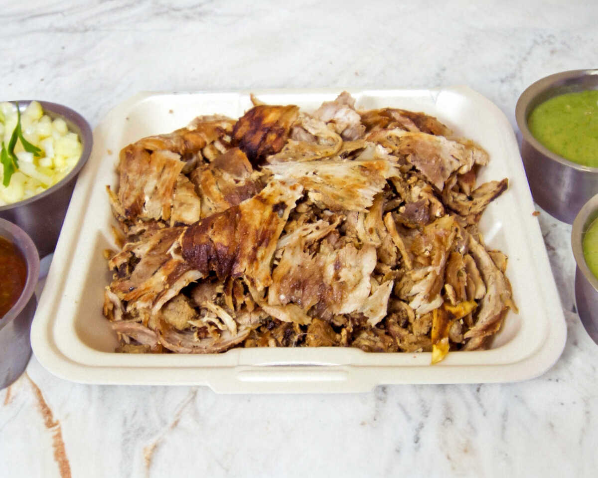 Platillo para máximo 1 persona, 230 gramos de carne árabe combinada con tocino, pimiento morrón, cebolla, queso gratinado, acompañado de 5 tortillas de maíz y salsa de piña.