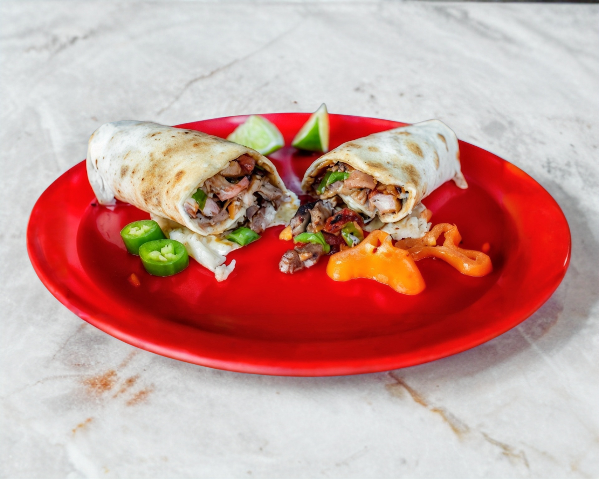 Deliciosa combinación de carne árabe con chorizo, tocino, pimiento morrón y queso gratinado envuelto en nuestro artesanal pan árabe.