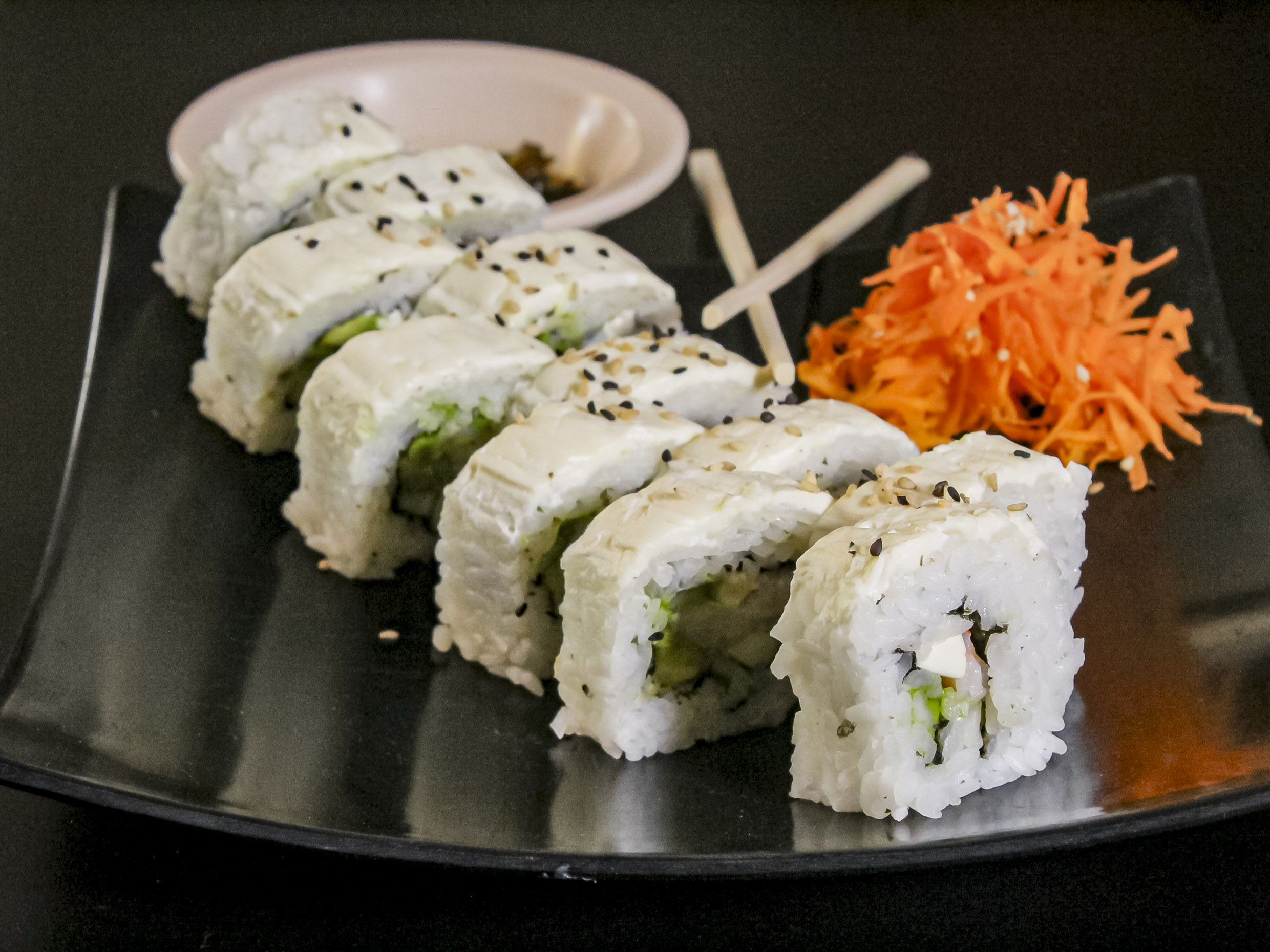salmon por fuera sobre una cama de philadelfia y camaron por dentro