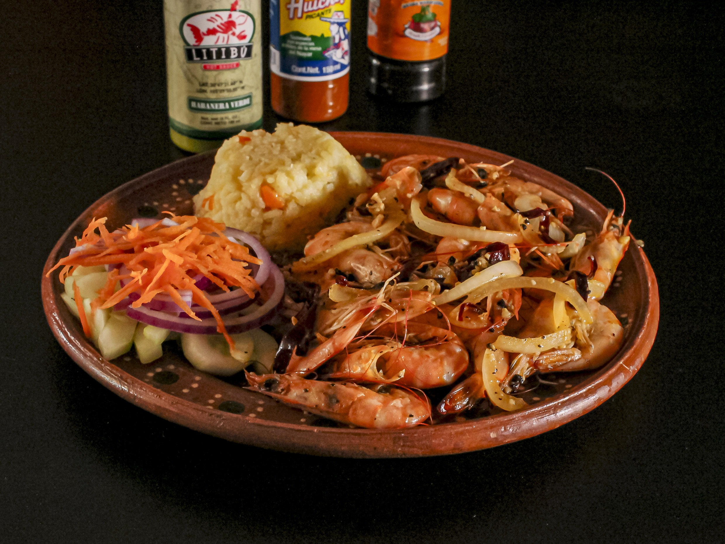 250 gr de camarones a la diabla acompañados de arroz y ensalada