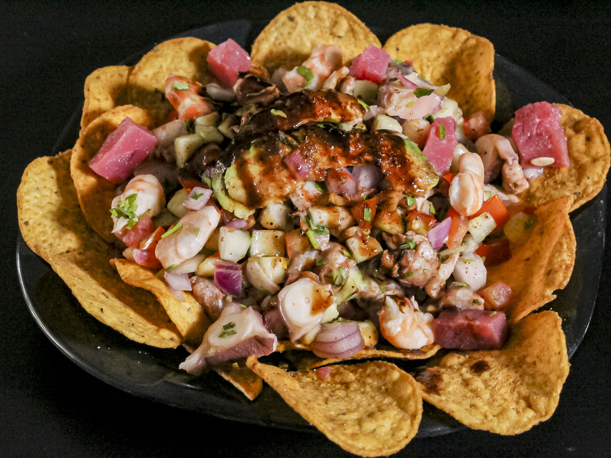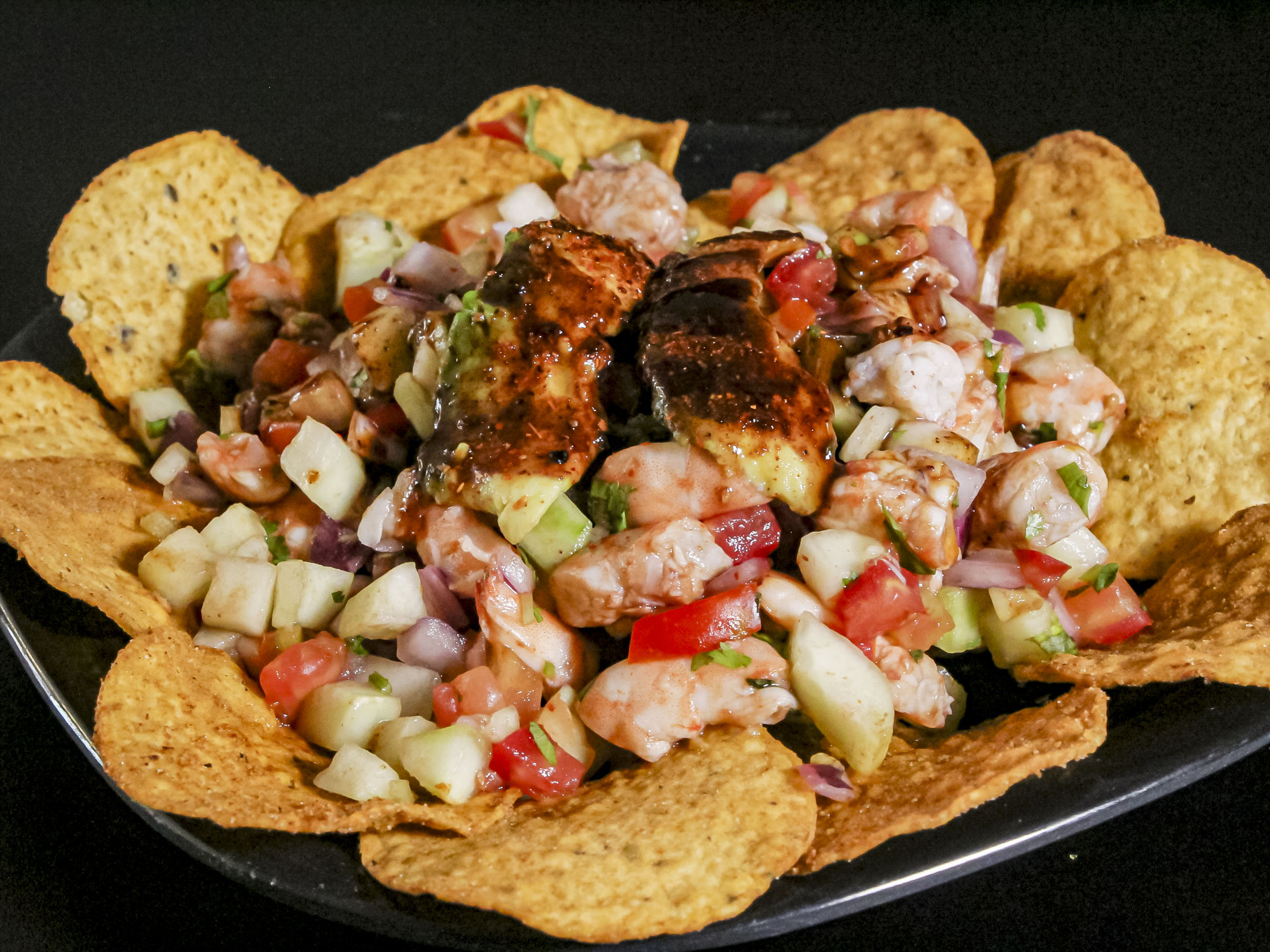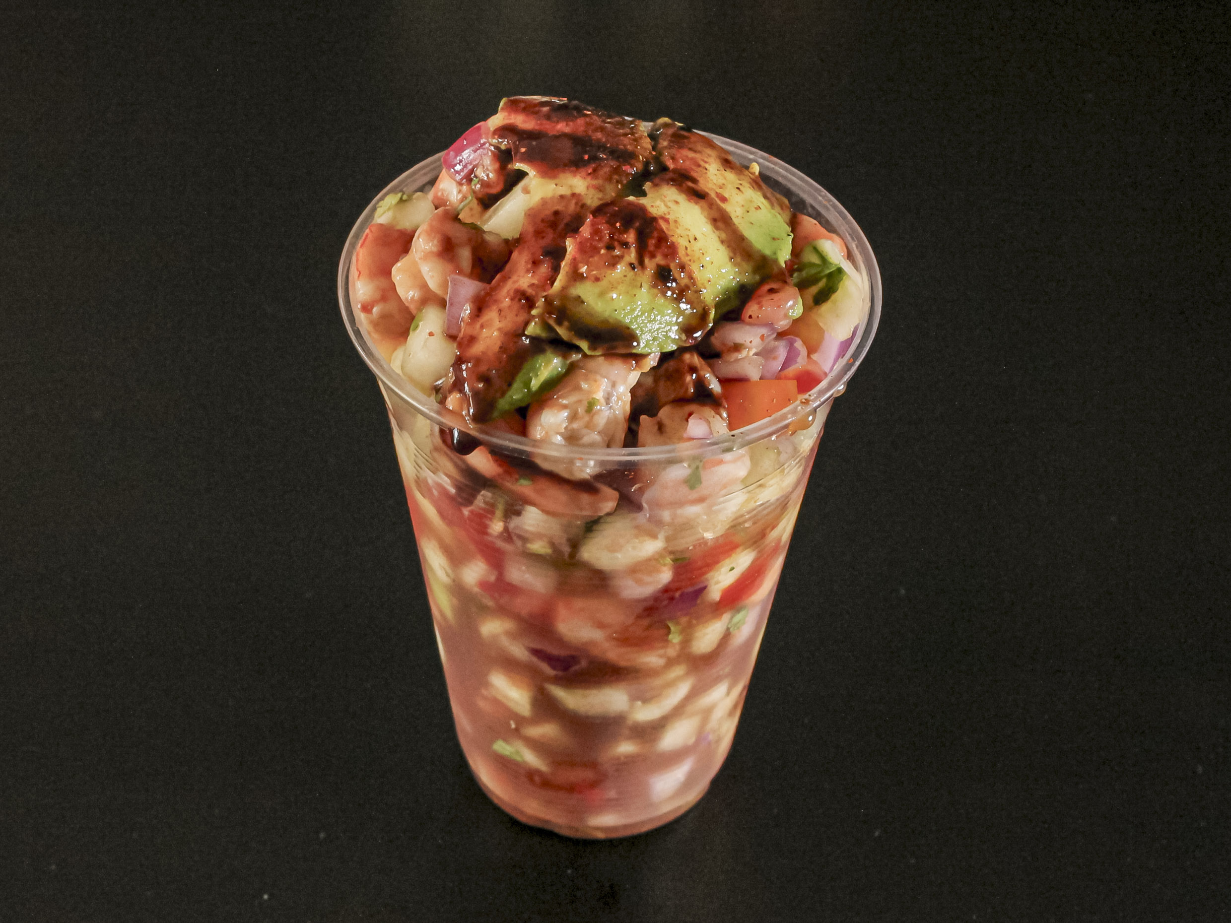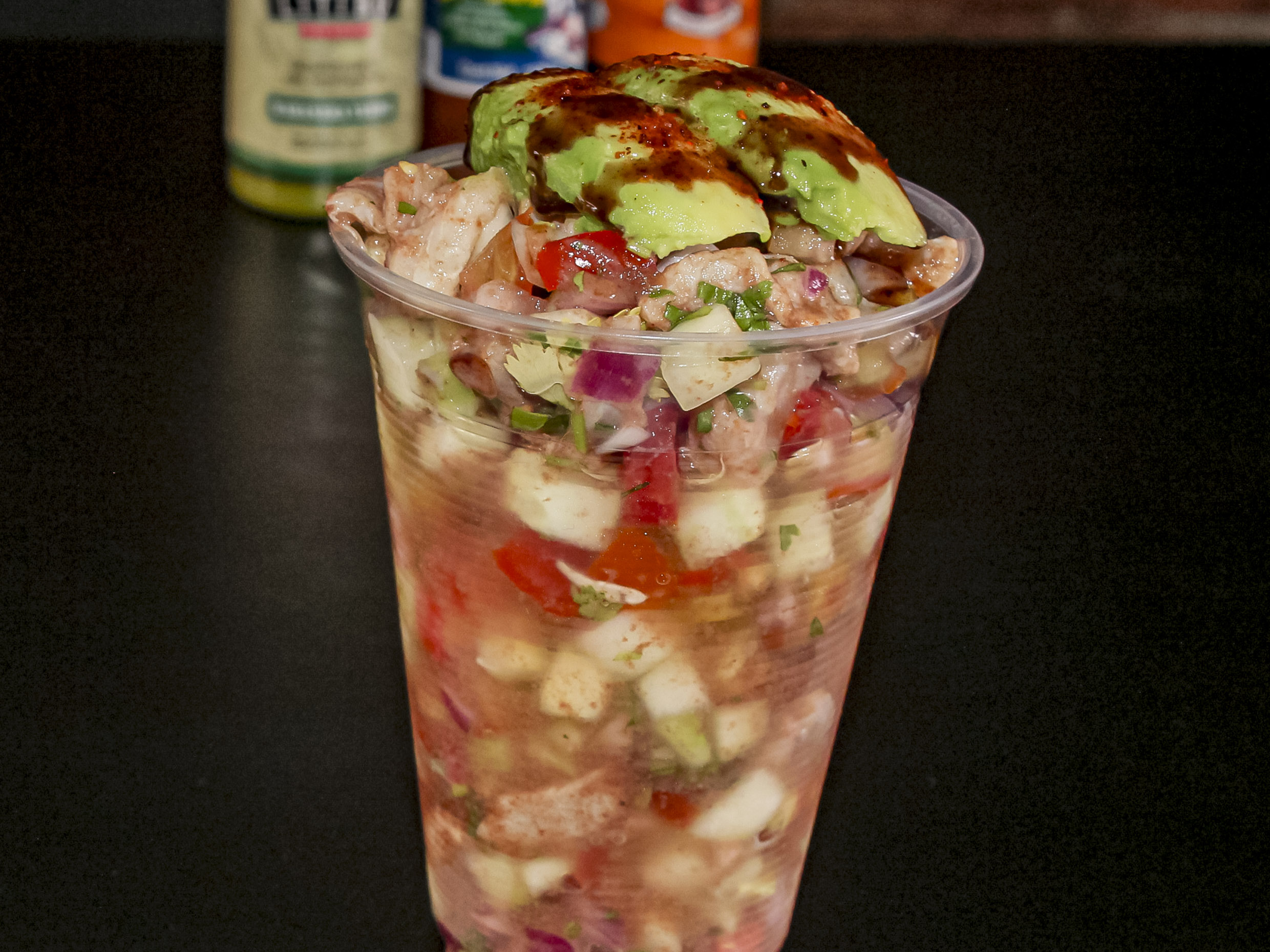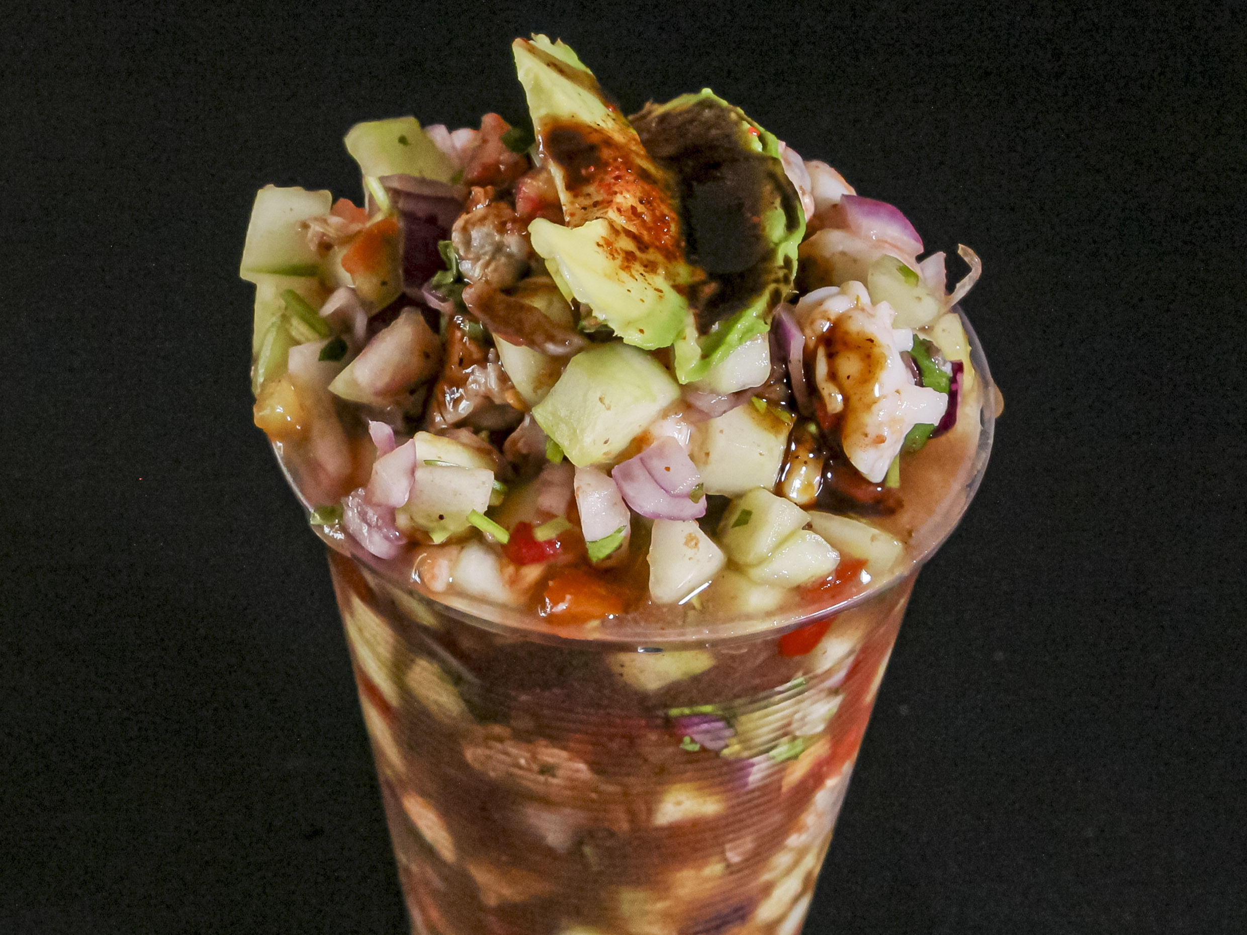 camaron cocido, camaron crudo, pulpo y pescado en cuadritos, acompañado de pepino, jitomate, cebolla y cilantro,salceado