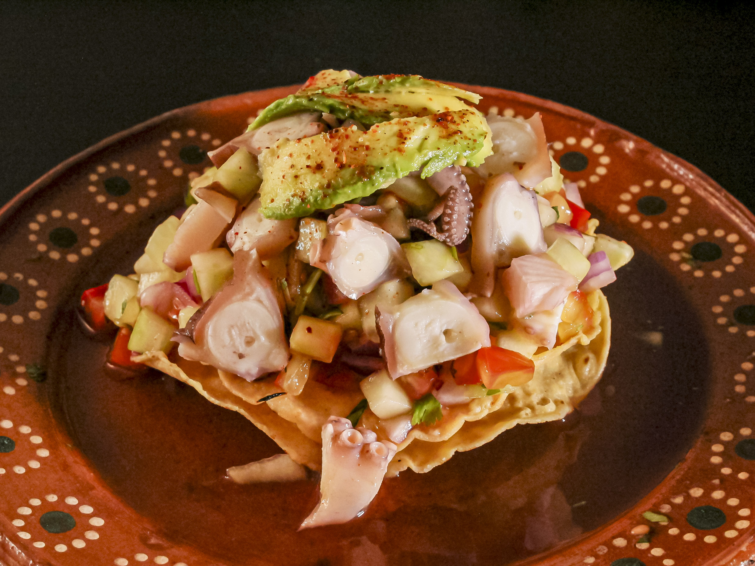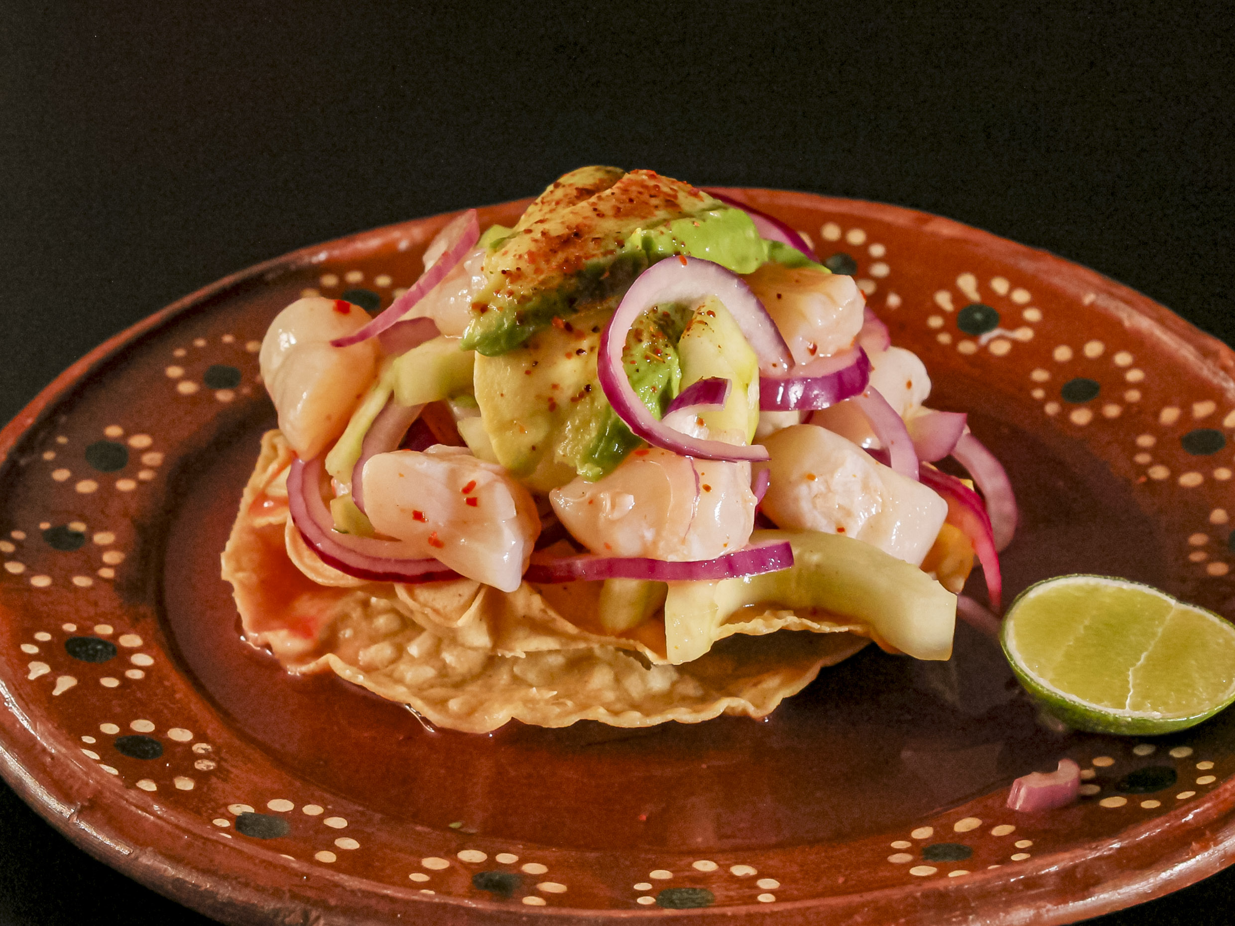 tostada de callo perla acopañado de pepino,jitomate,cebolla salceado