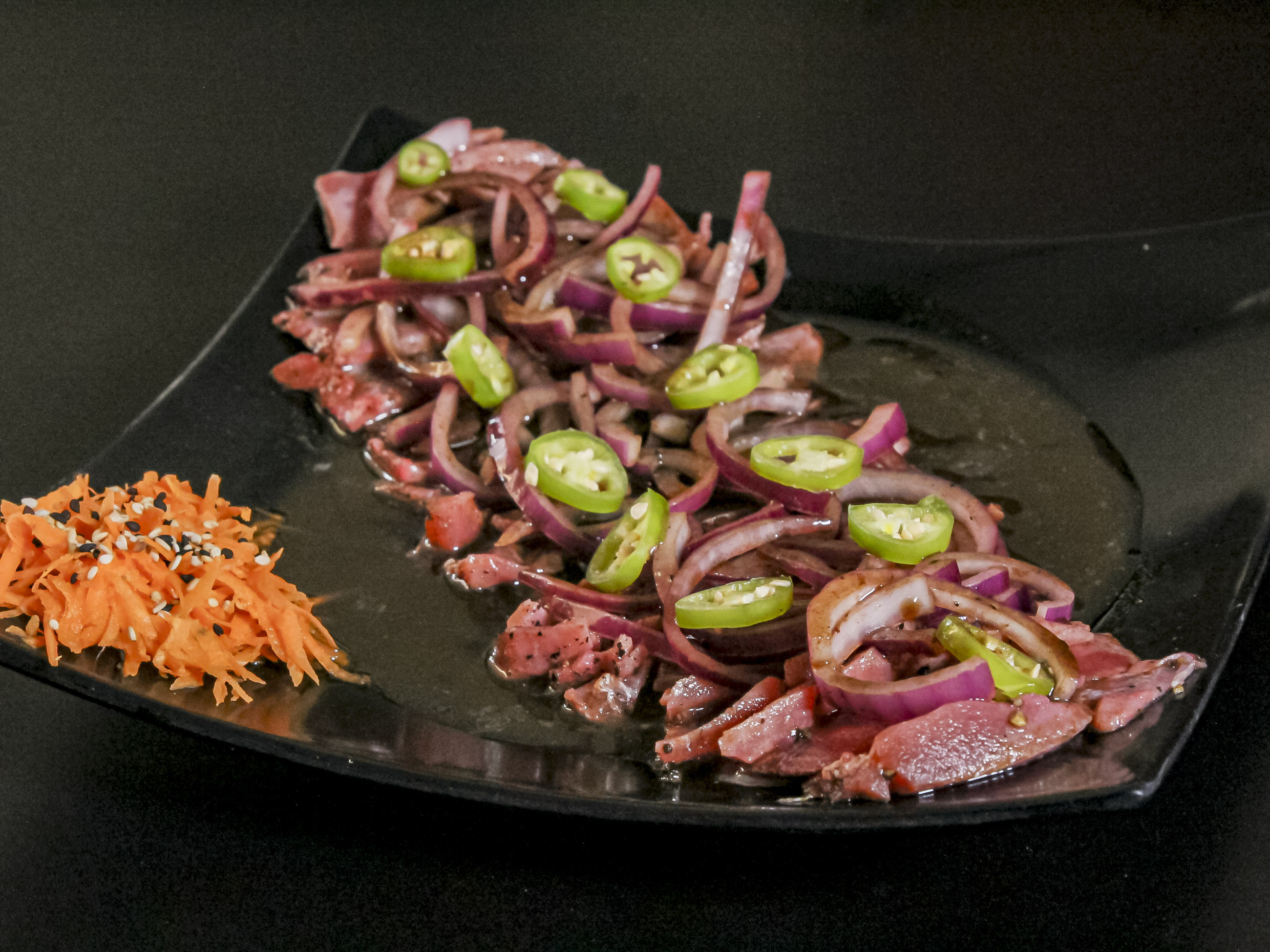 atun en cuadritos acompañado de cebolla en julianas, pepino en media lunas con un toque sabroso a furta de temporada
