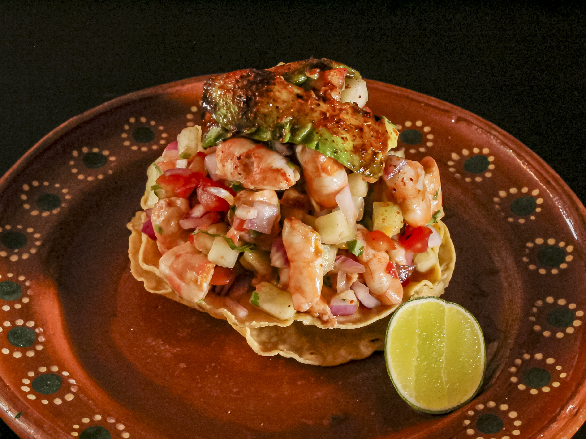 tostitos con camaron curtido con pepino,cebolla,jitomate y cilantro
