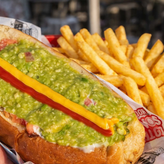 doble salchicha con queso nacho verduras y papas ala francesa