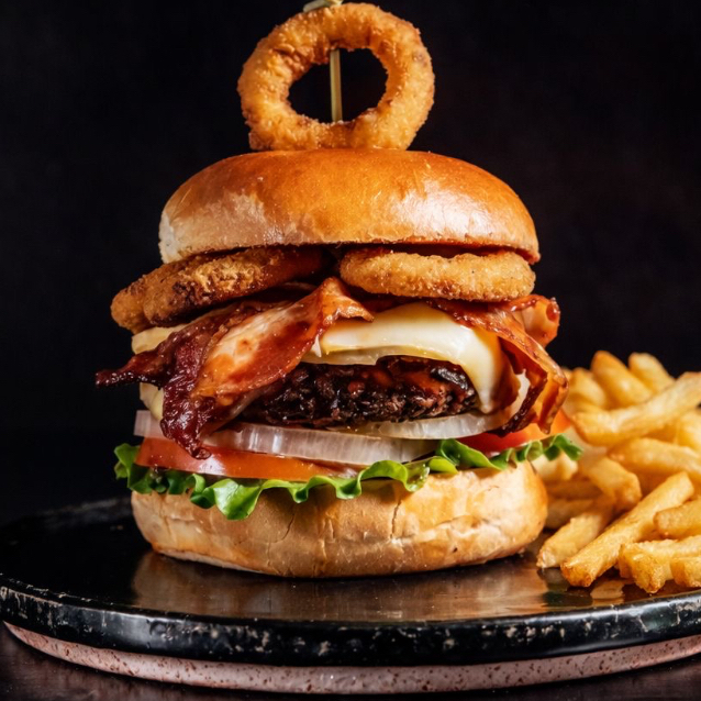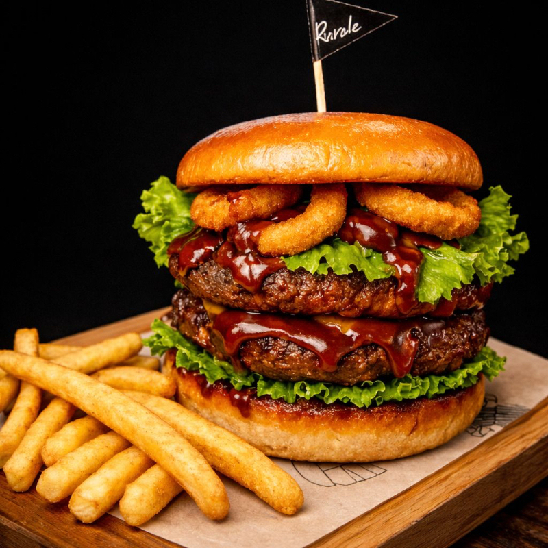Hamburguesa de res de doble carne con Bq y aros de cebolla