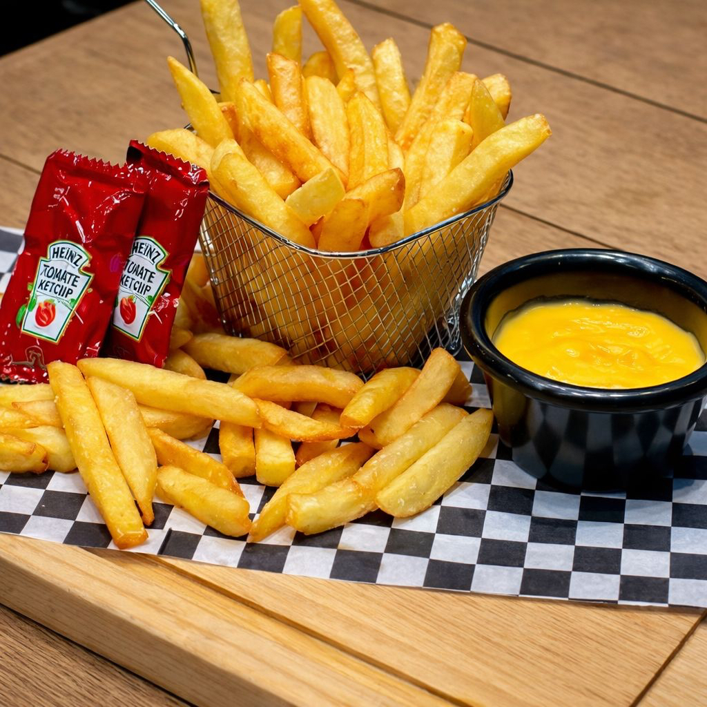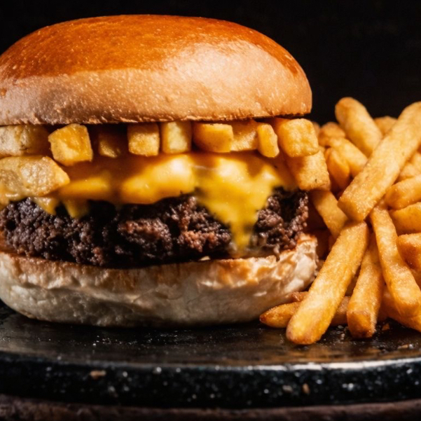 Hamburguesa con queso nacho y papas ala francesa