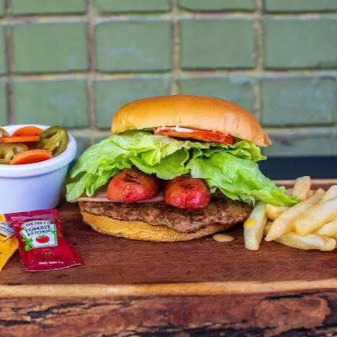 Hamburguesa ala plancha con salchicha , carne , queso verduras y ( papas ala francesa hasta agotar existencias)