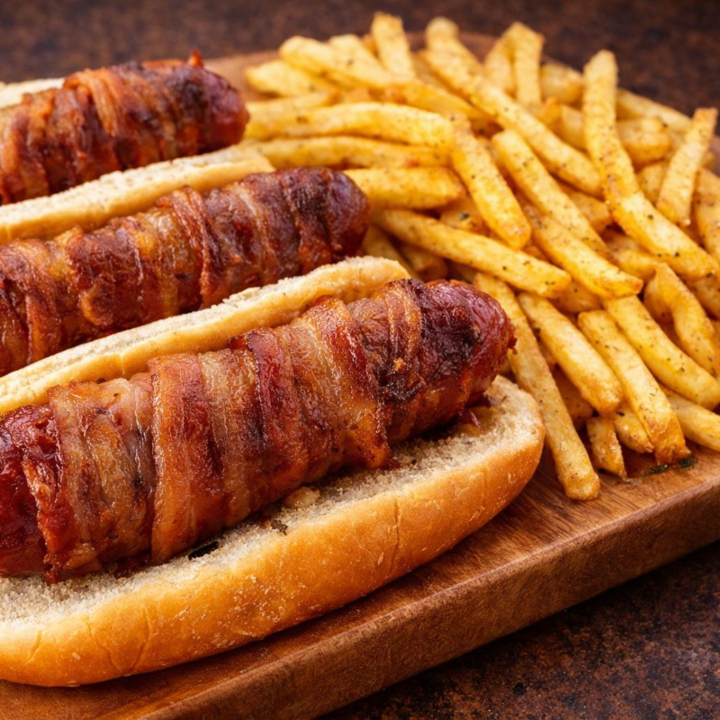 SALCHICHA ROJA CON TOCINO Y QUESO ASADERO CON VERDURA Y ( PAPAS ALA FRANCESA HASTA AGOTAR EXISTENCIAS)