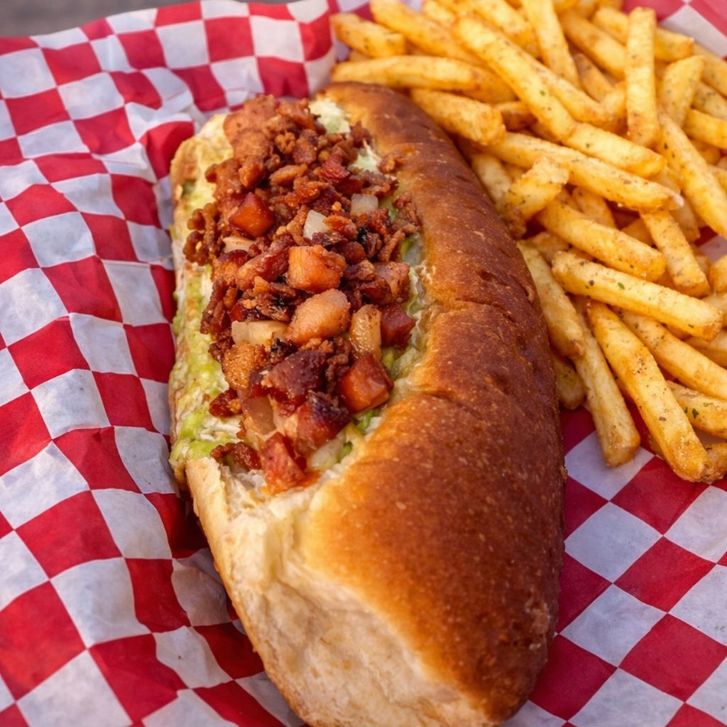 CON TOCINO Y QUESO NACHO VERDURAS Y ( PAPAS ALA FRANCESA HASTA AGOTAR EXISSTENCIAS)