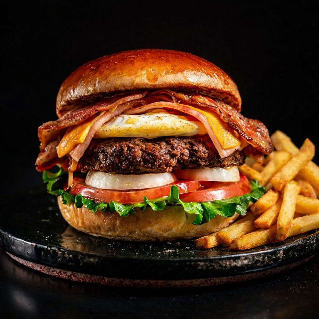 Hamburguesa de res al carbon , con huevo, tocino y queso verduras ( papas ala francesa hasta agotar existencias)