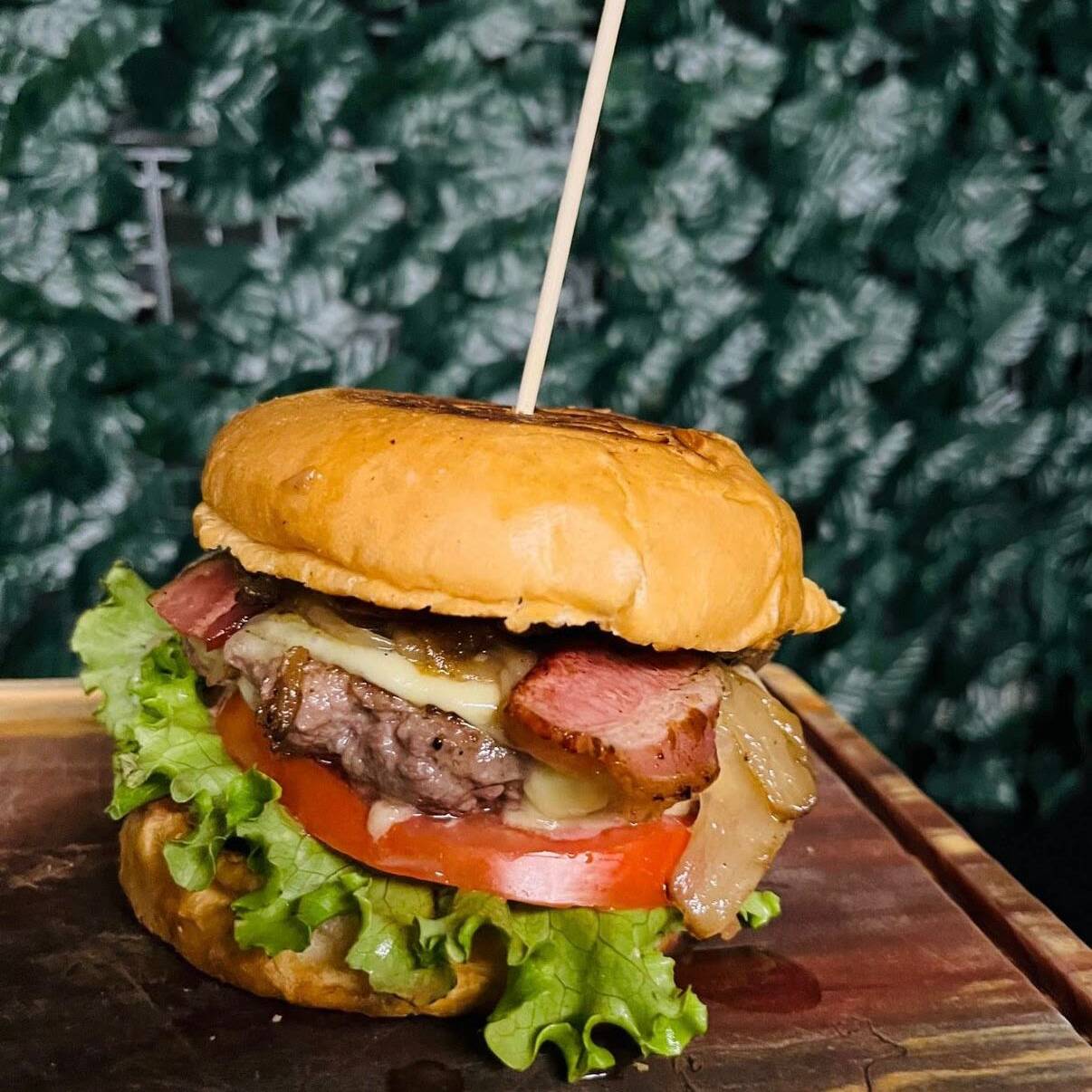 Hamburguesa de res, con cebolla caramelizada y tocino con jitomate, cebolla lechuga ( papas ala francesa hasta agotar existencias)