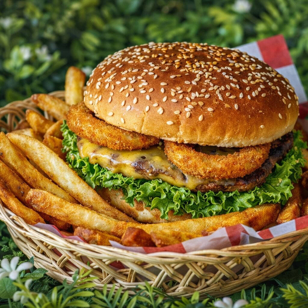 Hamburguesa de res con queso asadero aros de cebolla y Bq , con jitomate cebolla y lechuga y papas hasta agotar existencias
