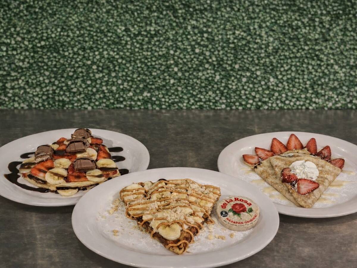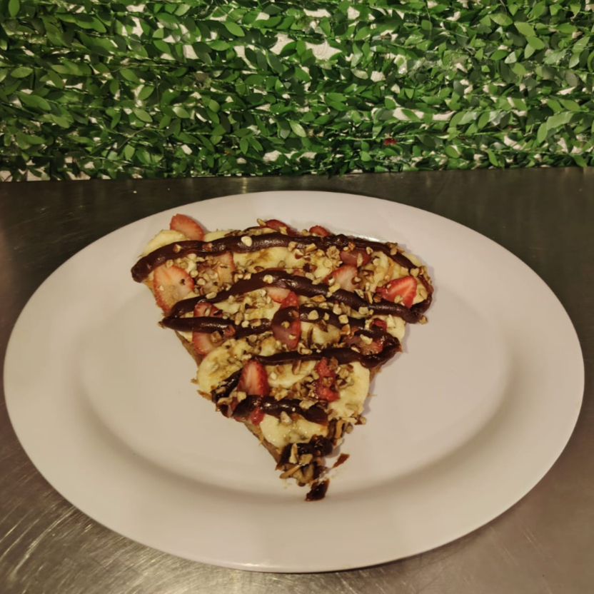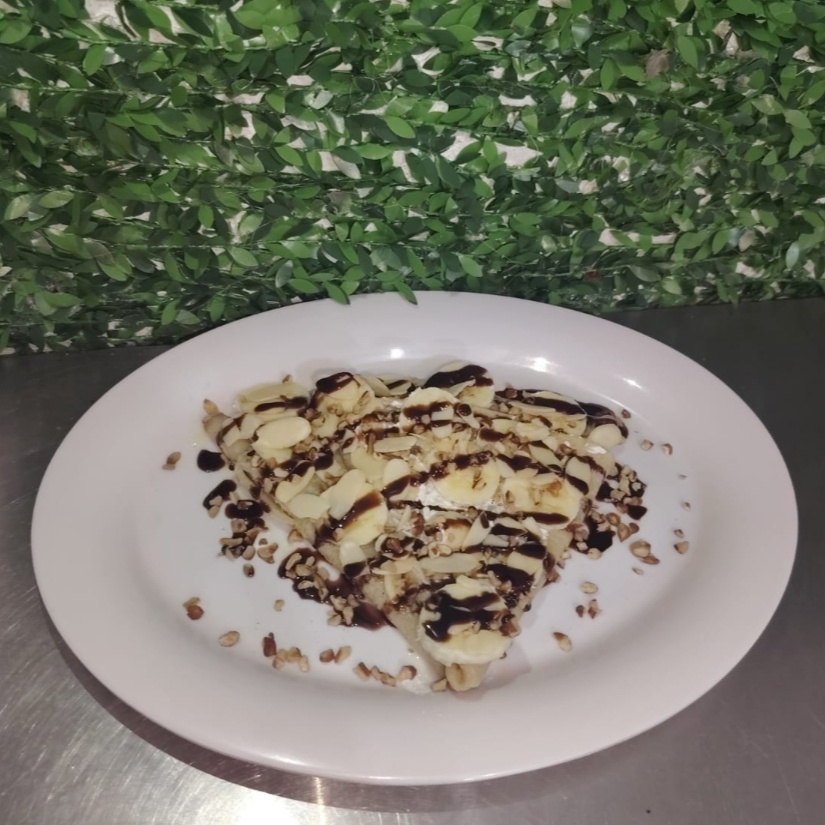 rellena de cajeta dulce, plátano y fresa fresca, con un toque crujiente de nuez picada.