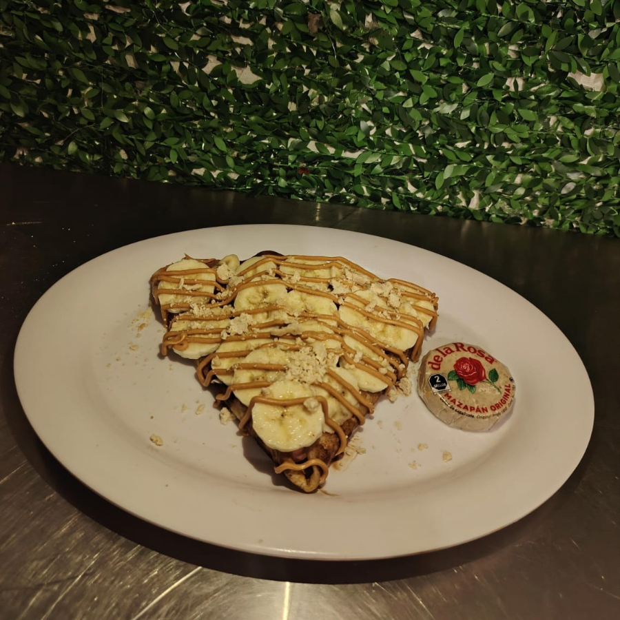 rellena de cremosa crema de cacahuate, plátano fresco, mazapán dulce, nuez crujiente y un irresistible toque de lechera.