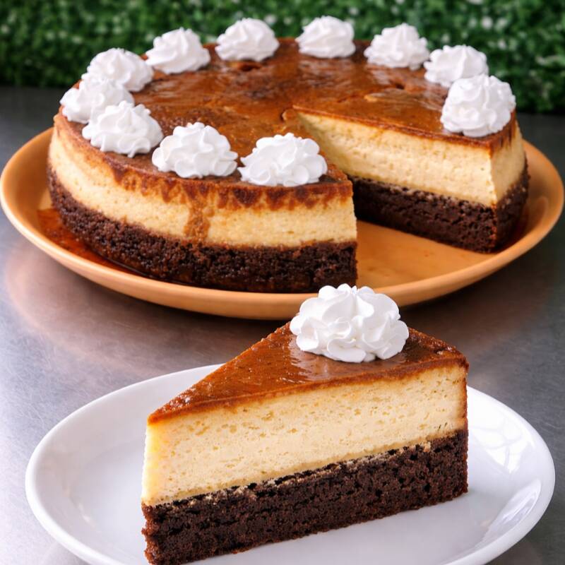 suave flan cremoso y esponjoso pan de chocolate, bañado con caramelo irresistible en cada bocado.
