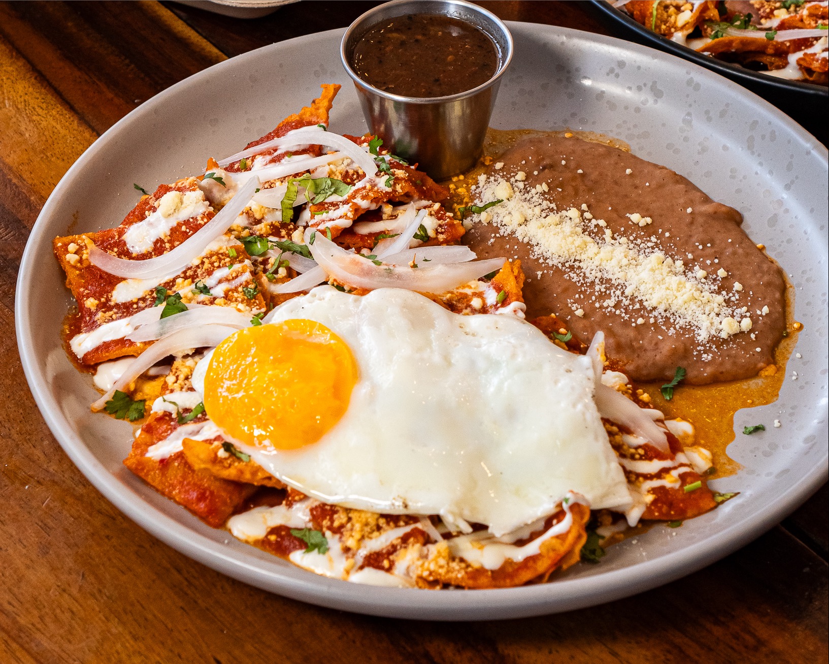 Chilaquiles rojos con crema, queso, cebolla, cilantro y un huevo estrellado. Acompañados de frijoles refritos y salsa.