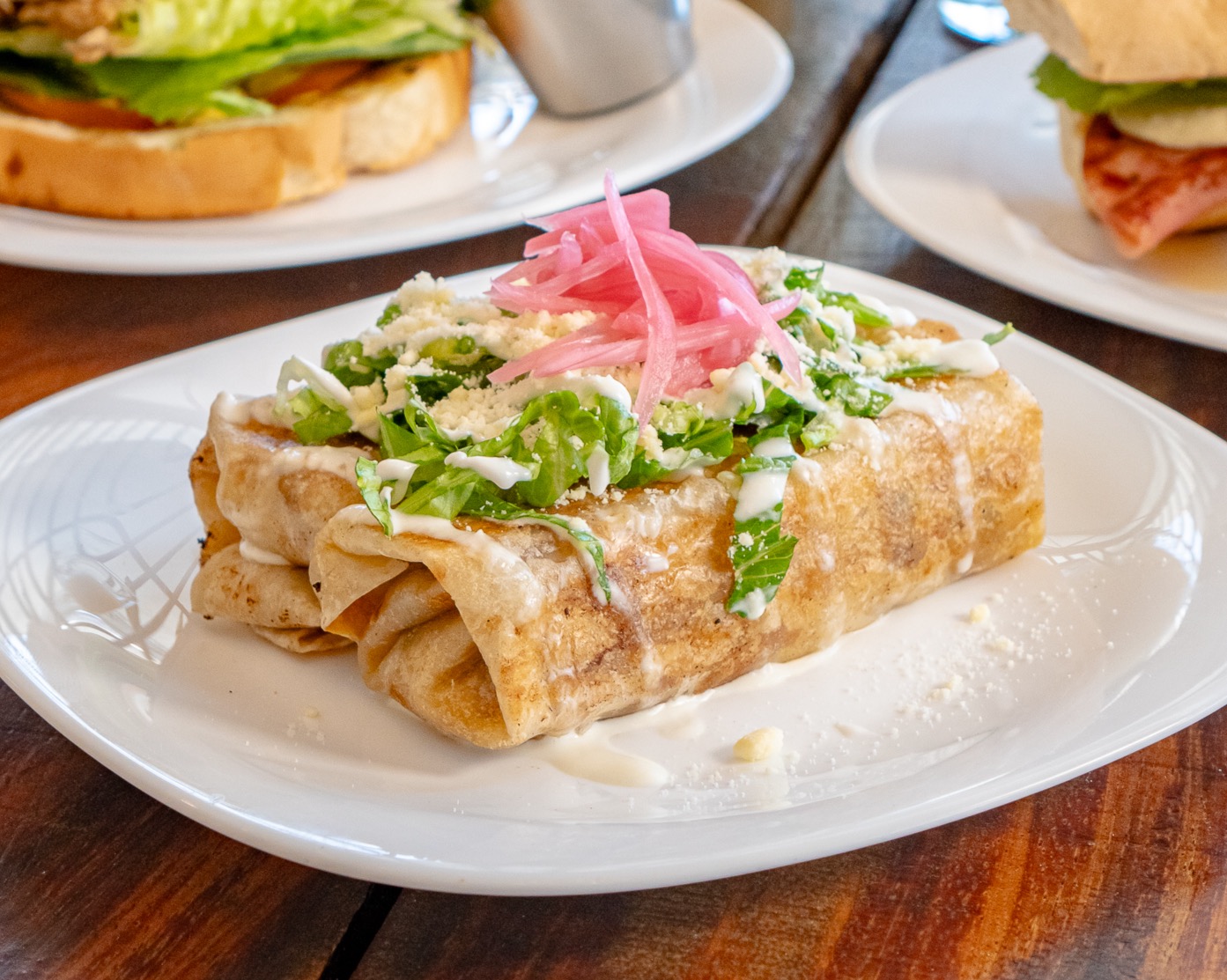Dos piezas rellenas de machaca con huevo, queso cheddar y coronados con lechuga, crema, queso y cebolla.