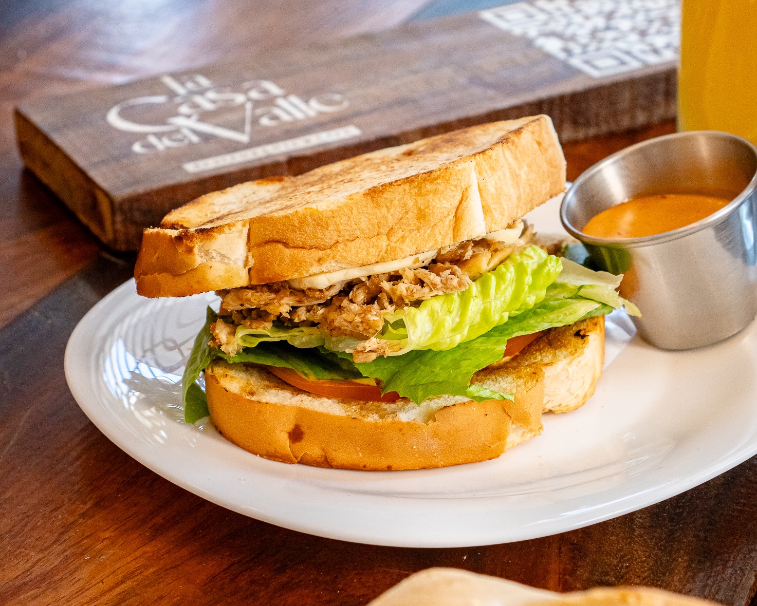 Sándwich de pollo, panela, jitomate, lechuga, cebolla y aderezo.