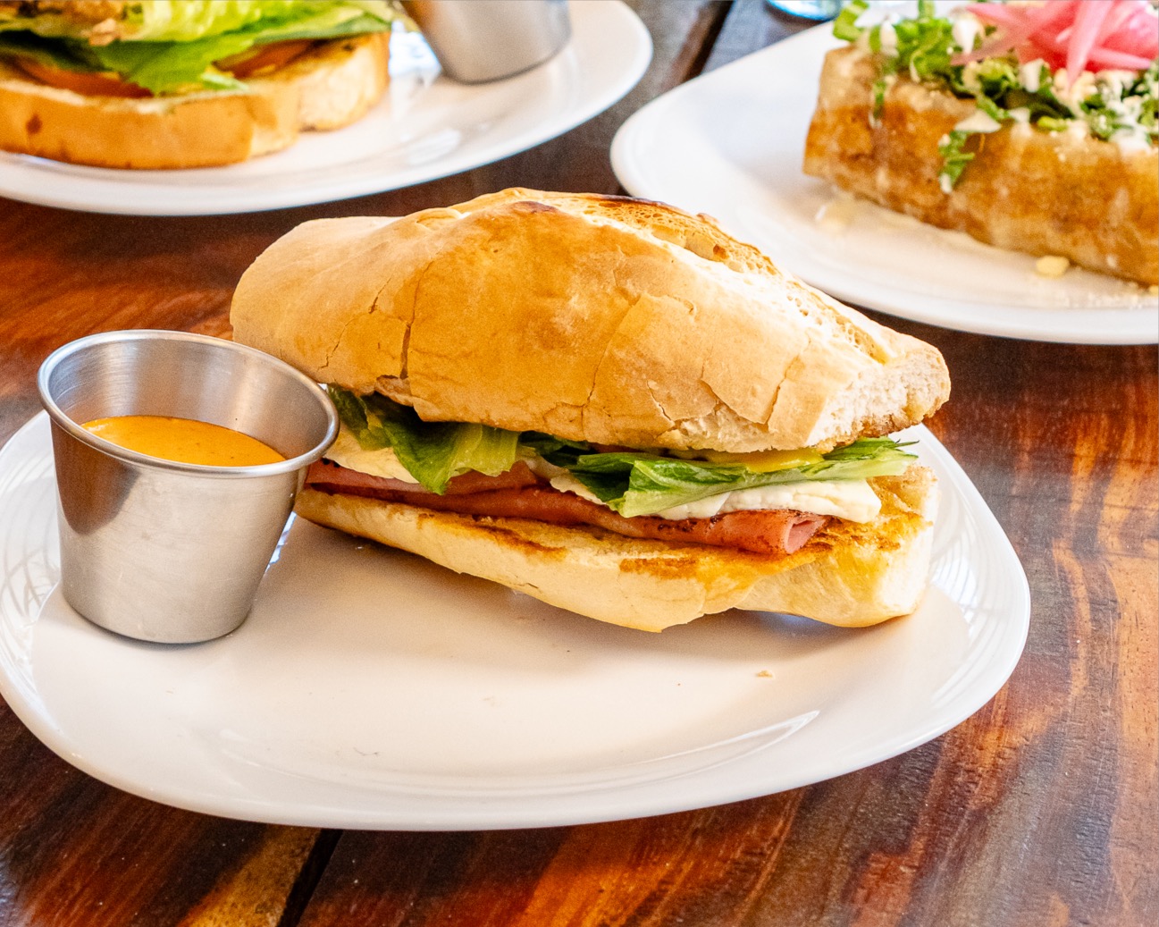 Sándwich de jamón, panela, jitomate, lechuga, cebolla y aderezo.