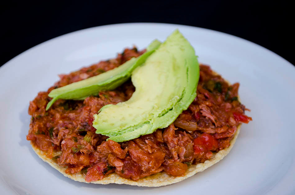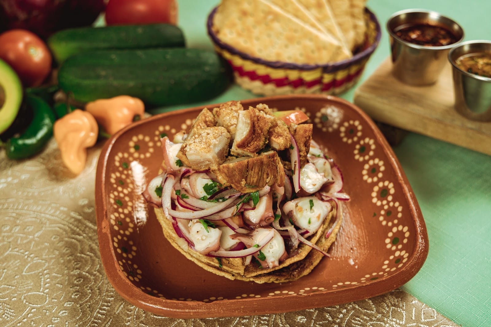 (100 gr.) Pepino, cebolla, jitomate y cilantro, coronado con guacamole y chicharrón de cerdo, en tostada de tortilla zarandeada.