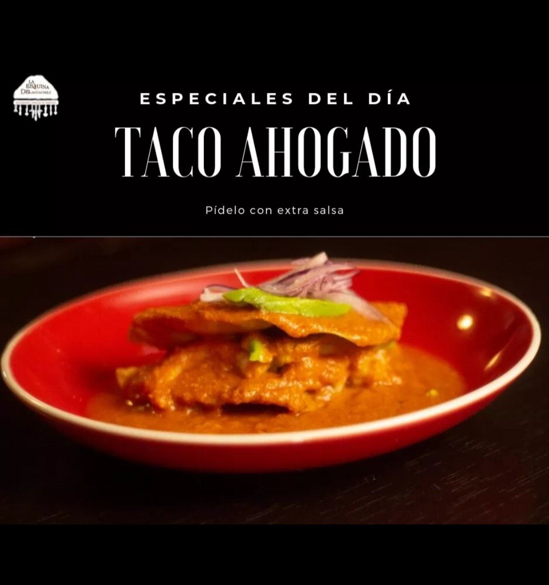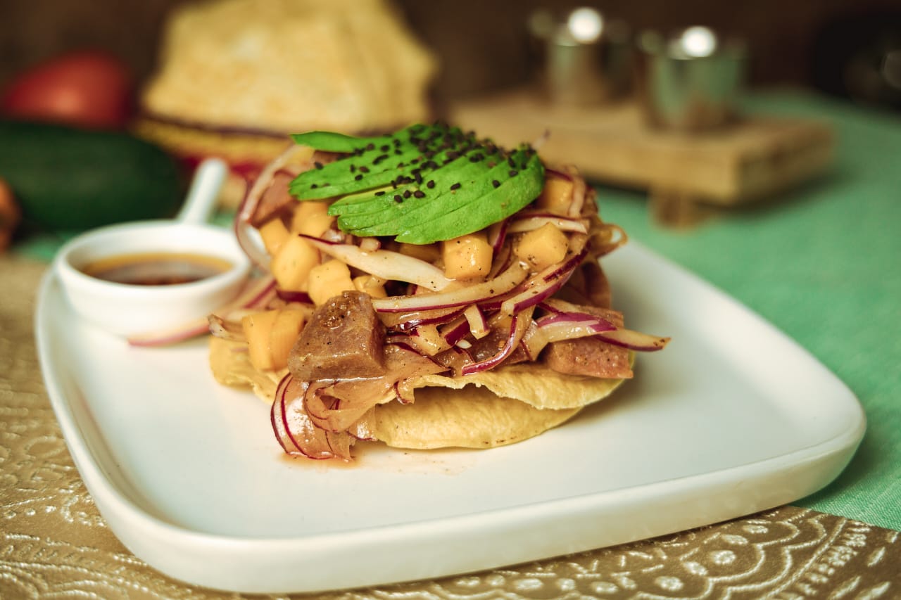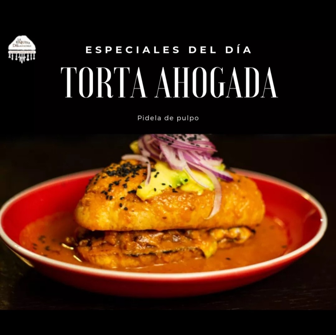 (Pulpo al pastor y costra de queso) sobre birote dorado, láminas de aguacate y bañada en una salsa especial de la casa, coronado con aguacate y cebolla desflemada.