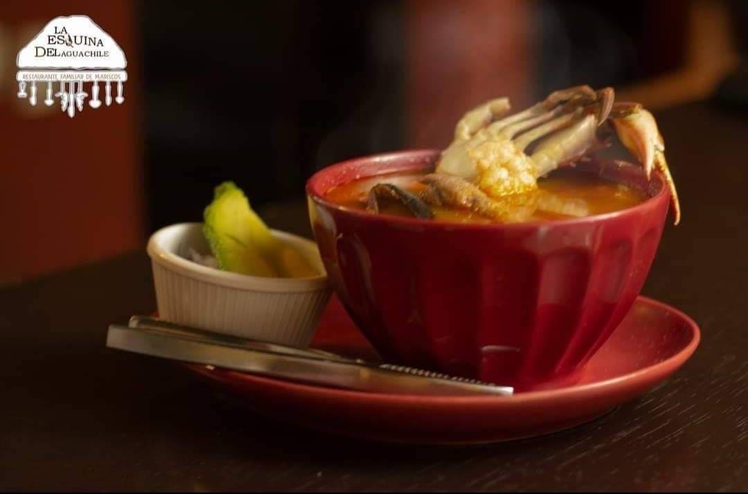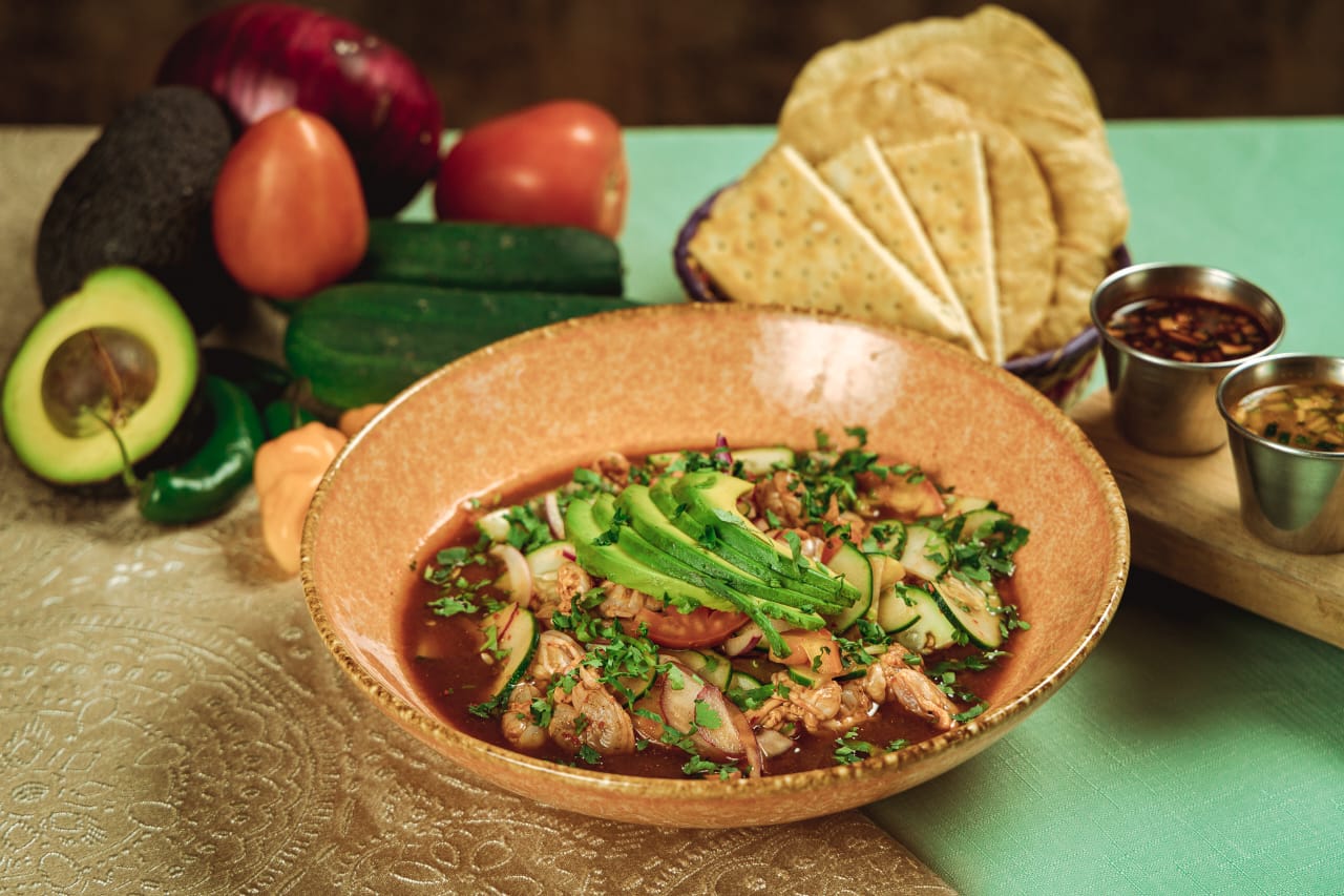 (Sopa hecha a base de caldos de mariscos, con Camarón, Pulpo, Pescado, Jaiba, Caracol, Mejillón y Callo de Almeja) Acompañada de pepino, cebolla y aguacate.