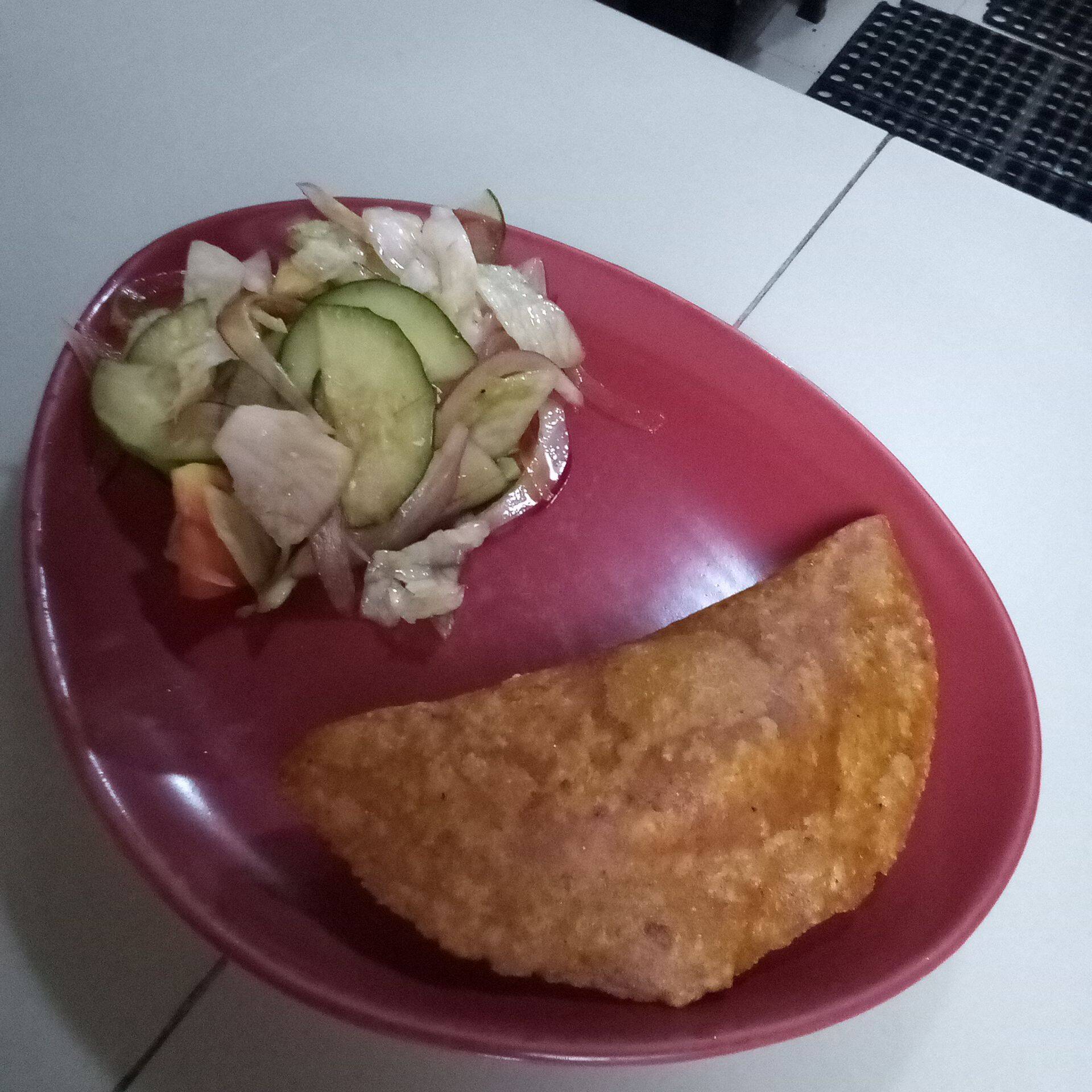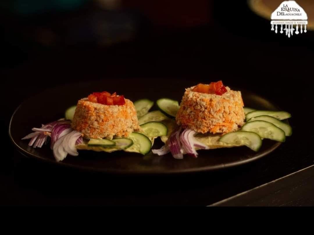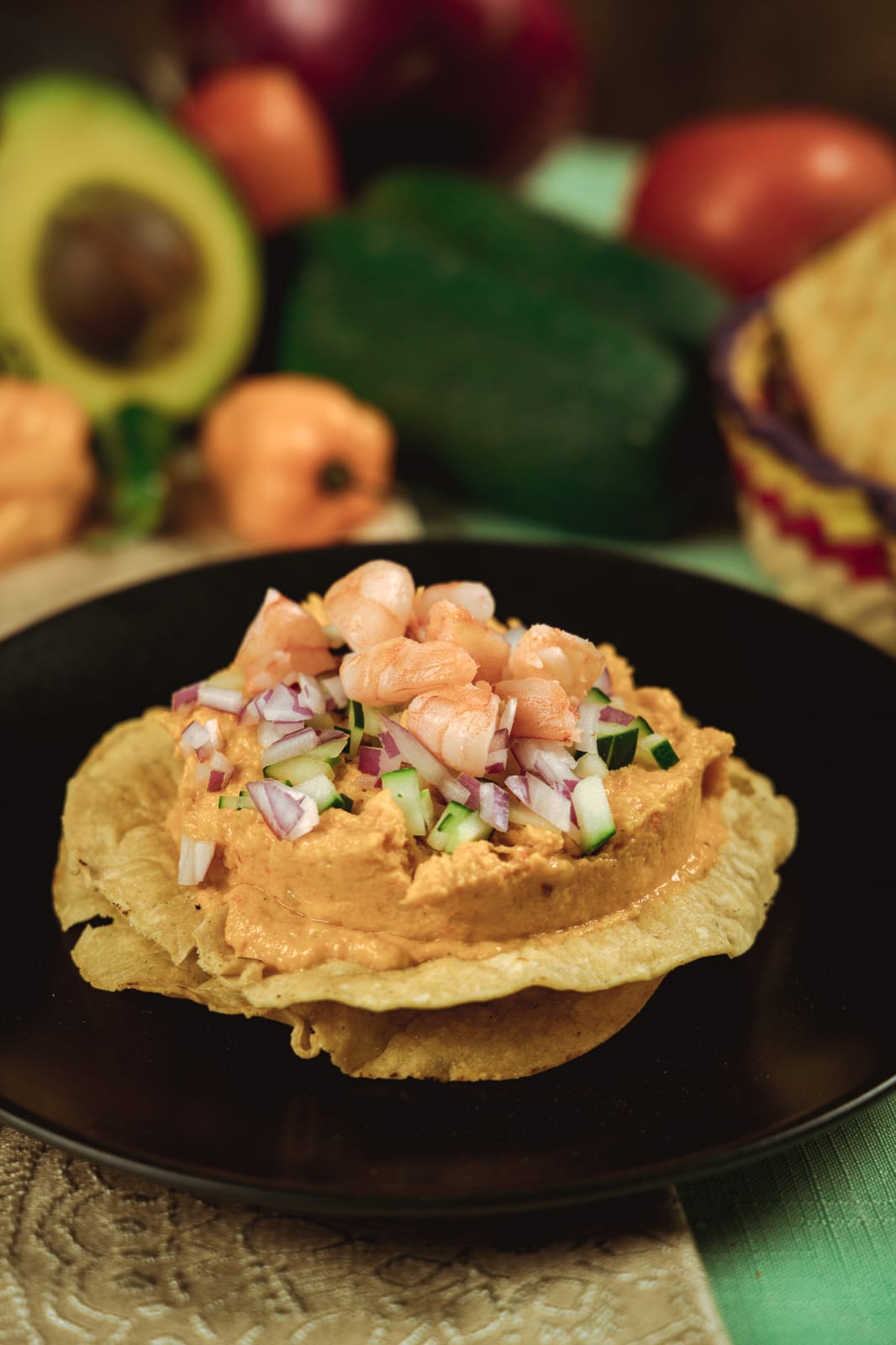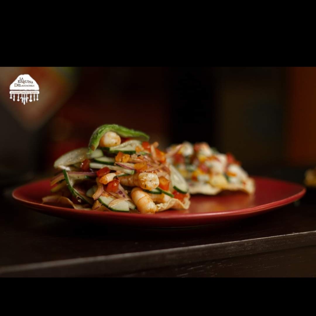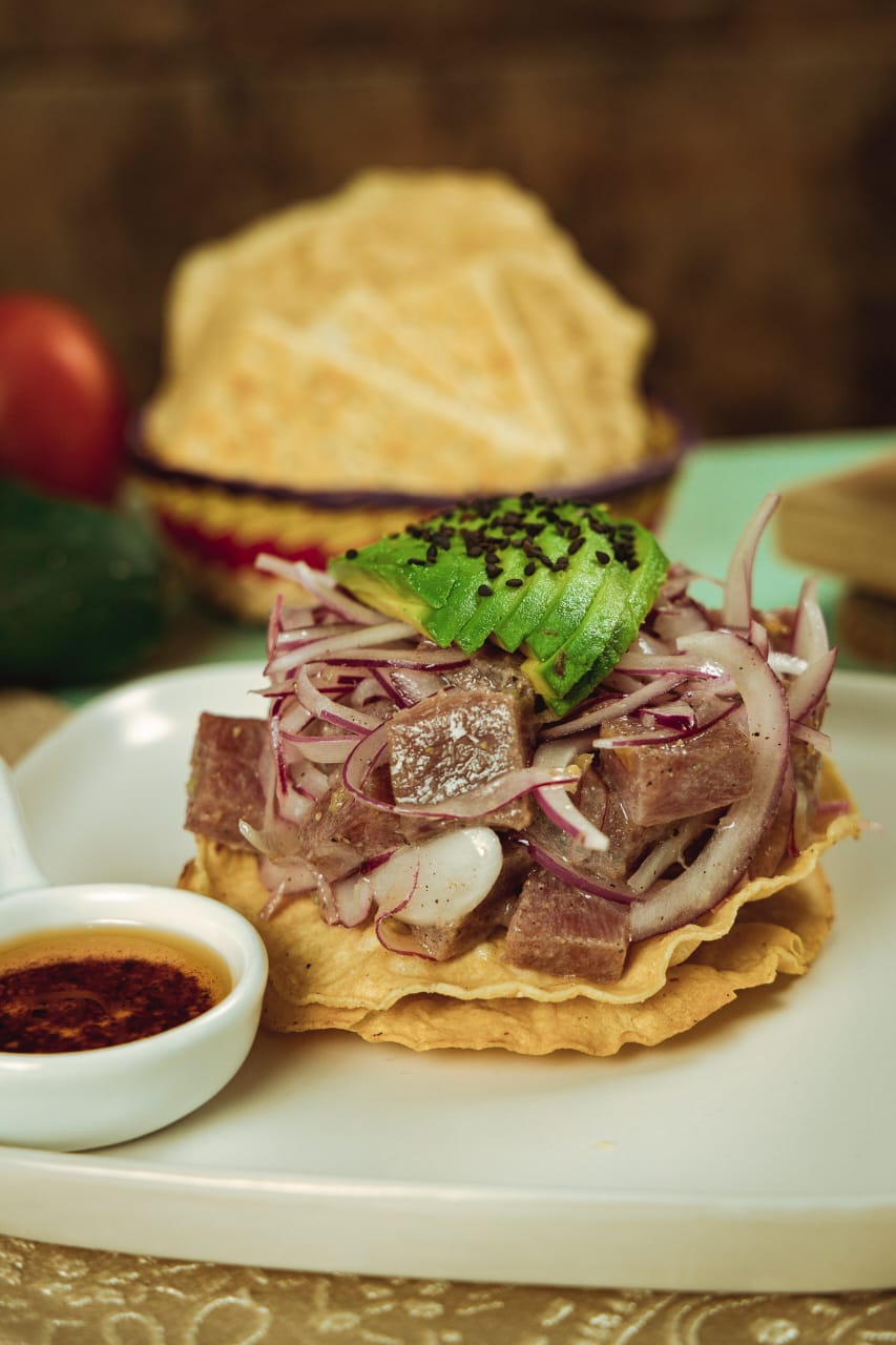(Tortilla de maíz frita con base de paté de camarón, bañado en una salsa especial de la casa, coronado con aguacate y cebolla desflemada).