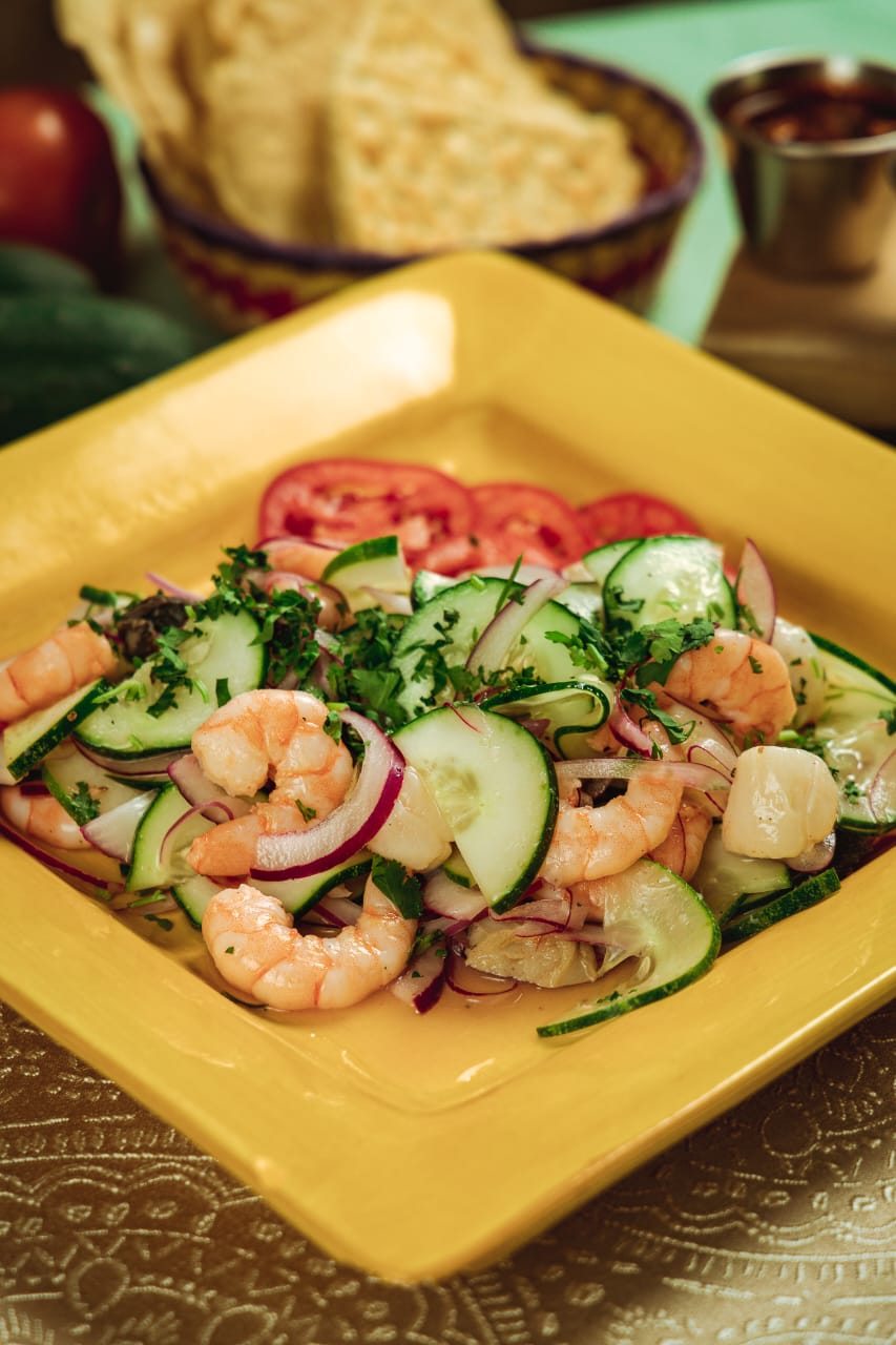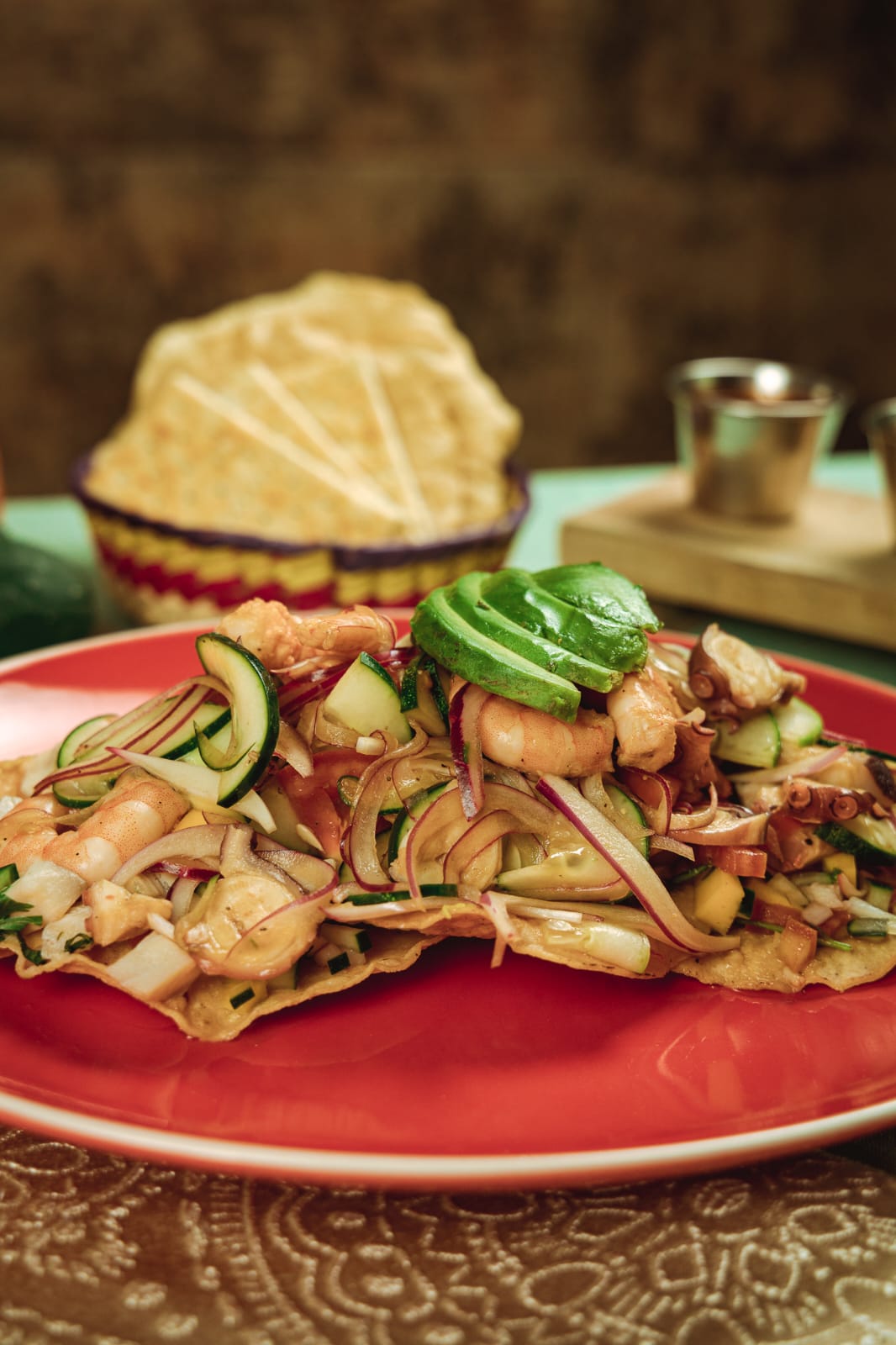 (150 gr. De camarón cocido y pulpo) Pepino, cebolla y jitomate, sobre una cama de ceviche de pescado en trozos, coronado con aguacate.