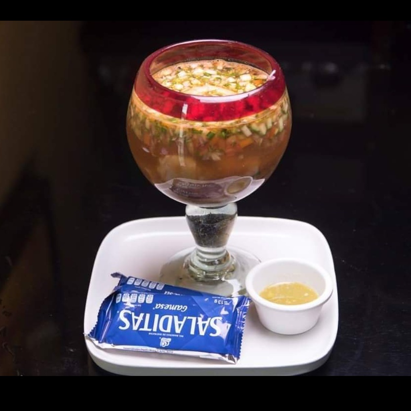 (220 gr. De camarón crudo) Pepino, cebolla, jitomate y cilantro. Preparado con salsas negras, clamato, chile serrano y habanero.