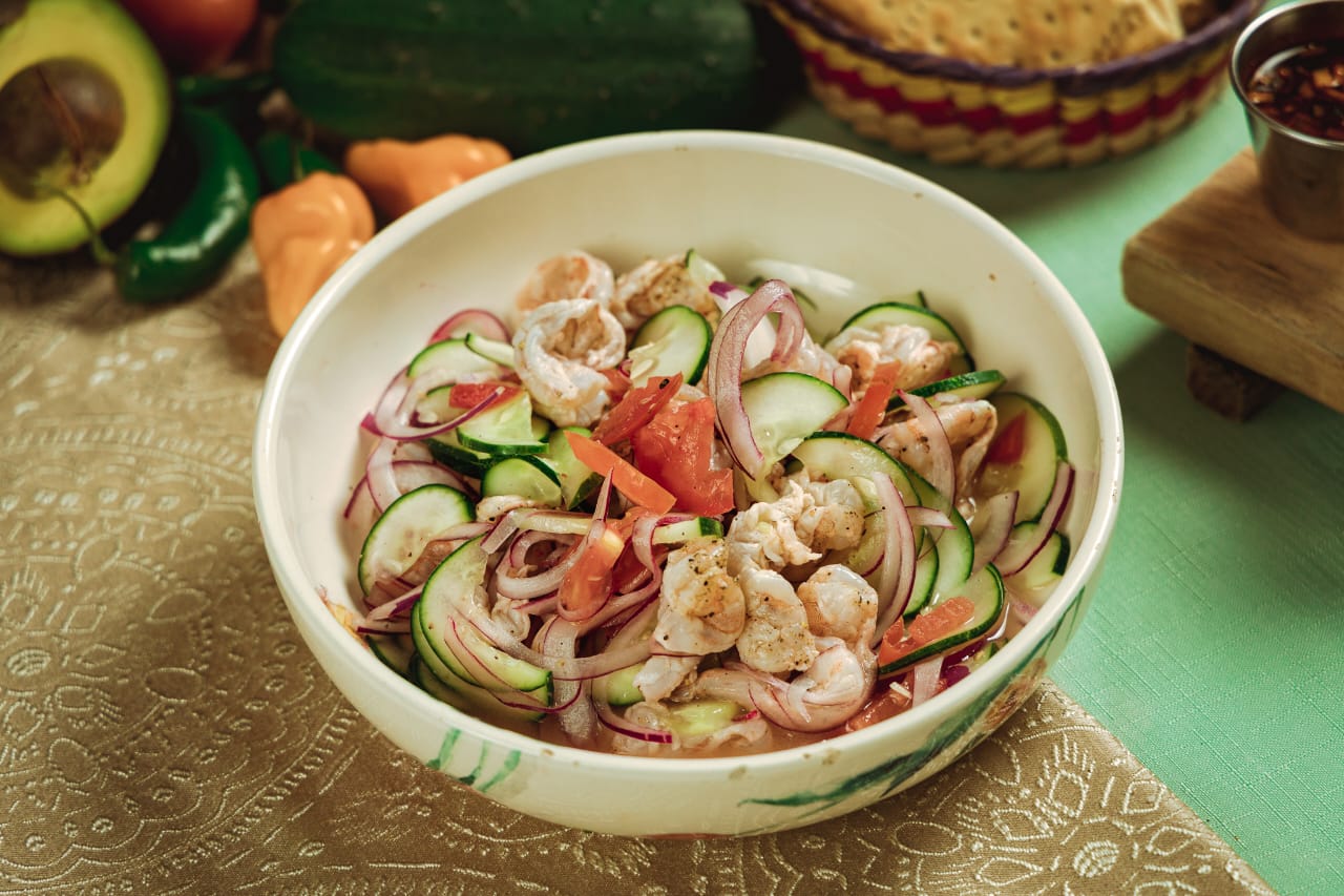 (220 gr. De camarón crudo) Pepino y cebolla. Preparado con mezcla de chiles (serrano, habanero, chiltepín y chile de árbol seco).