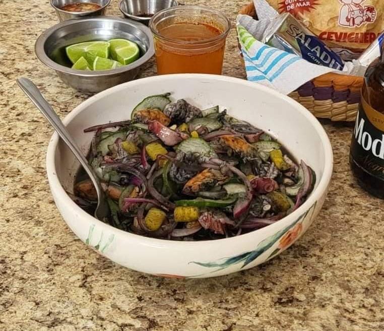 (150 gr. De atún crudo y pulpo) Pepino, cebolla y jitomate, coronado con aguacate y machaca de res.