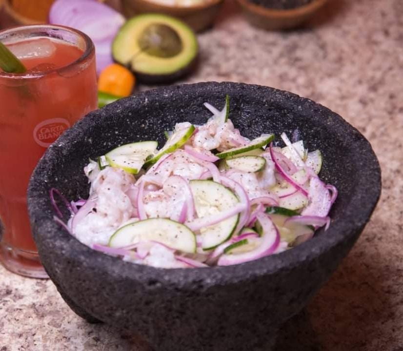 (220 gr. De camarón crudo) Pepino, cebolla y aguacate. Preparado con chile serrano y habanero.