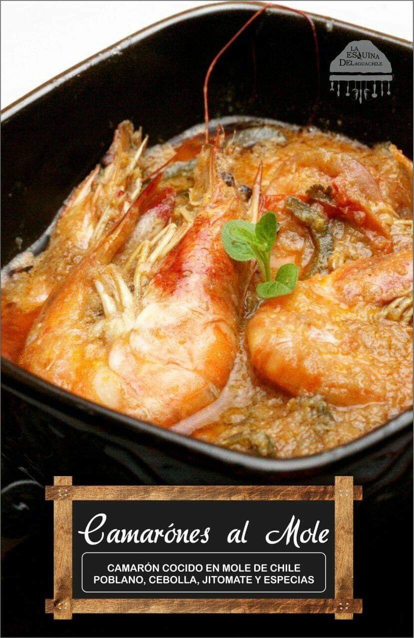 (Camarón cocido en mole de chile poblano, cebolla, jitomate y especias) Acompañado de pan con mantequilla.