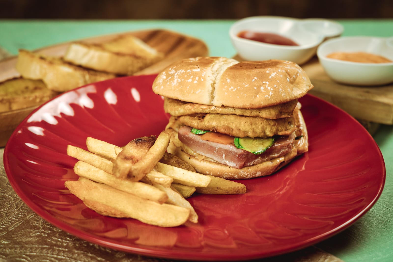 (120 gr. De medallón de atún) marinado en pesto a la plancha con costra de queso, calabaza, zanahoria y aros de cebolla, acompañada de papas fritas y aderezo de mostaza.