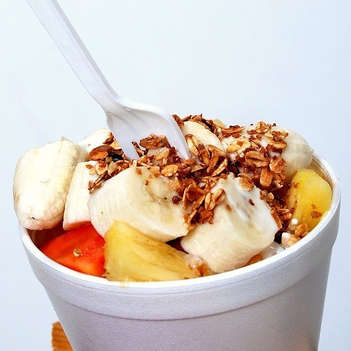 Manzana, platano, guayaba, fresa, preparacion especial de crema para bionico, cereales: granola, coco, pasas, nuez, amaranto