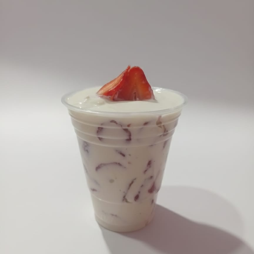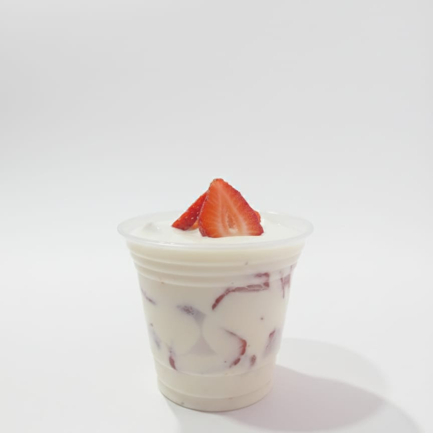 Vaso de 10 onzas con relleno de Crema de la casa, fresa picada y 1 topping a elegir