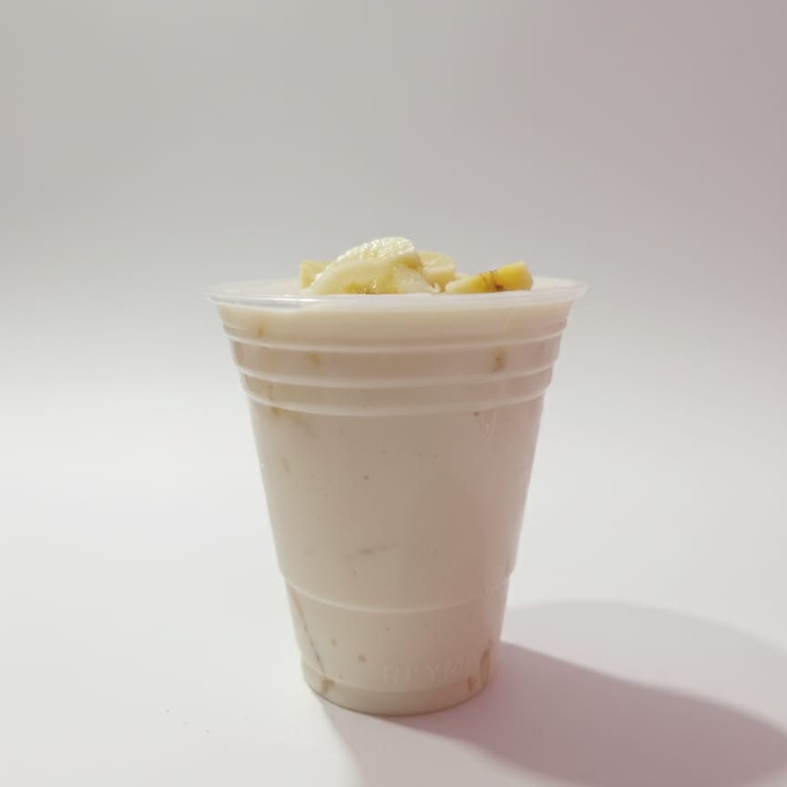 vaso de 14 onzas relleno con crema de la casa acompañado de platanos rebanados mas 2 toppings a elegir