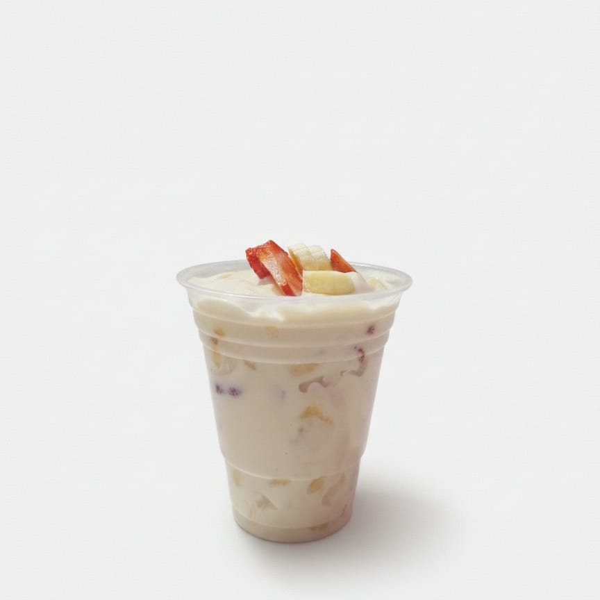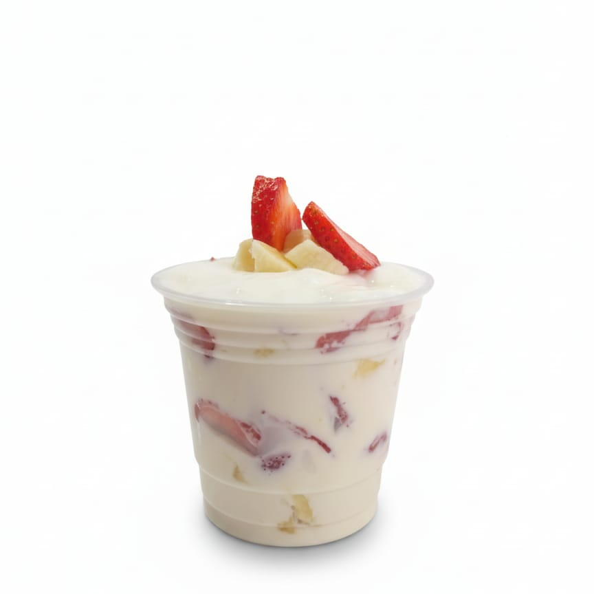 vaso de 10 onzas relleno de crema de la casa acompañado de fresas y plátanos frescos mas 1 topping a elegir
