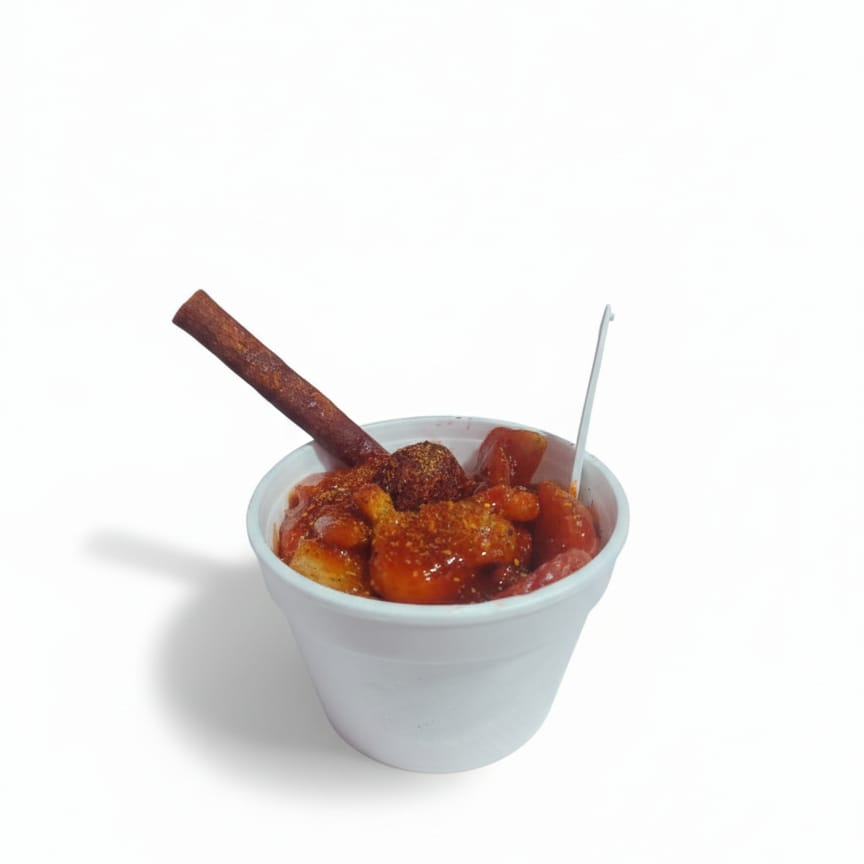 Helado de agua de sabor a elegir, fresas frescas en trozos salsas y bola de tamarindo picosito