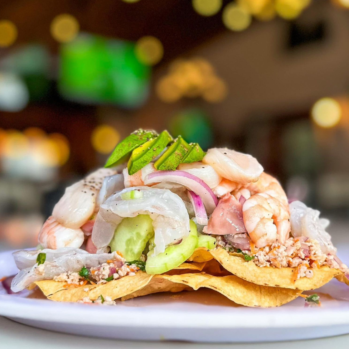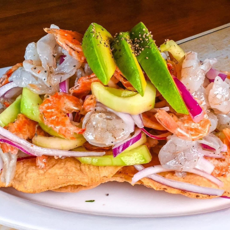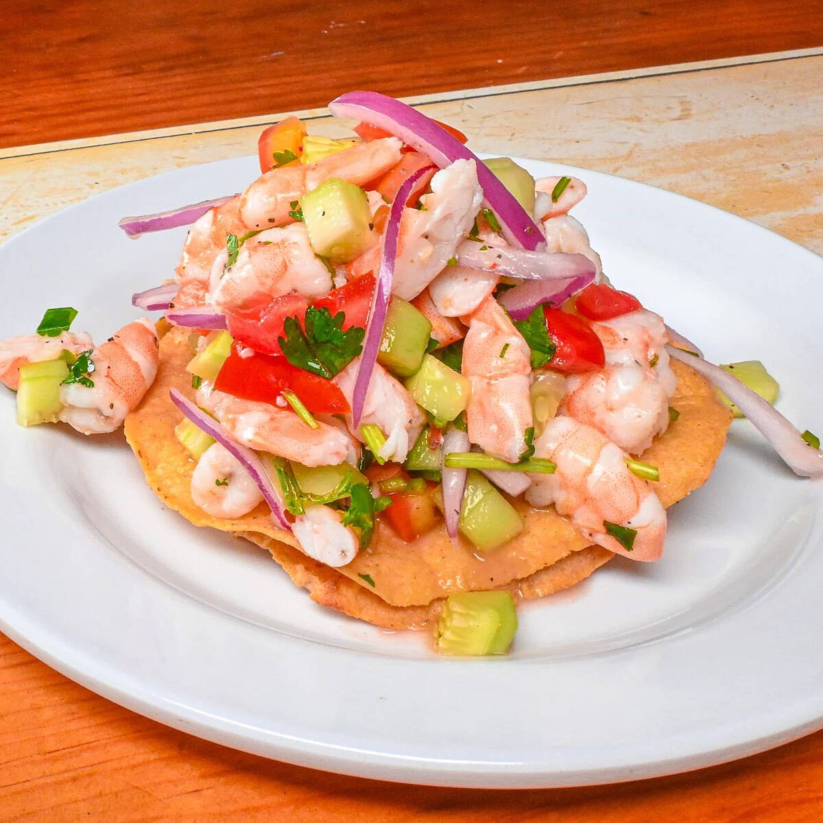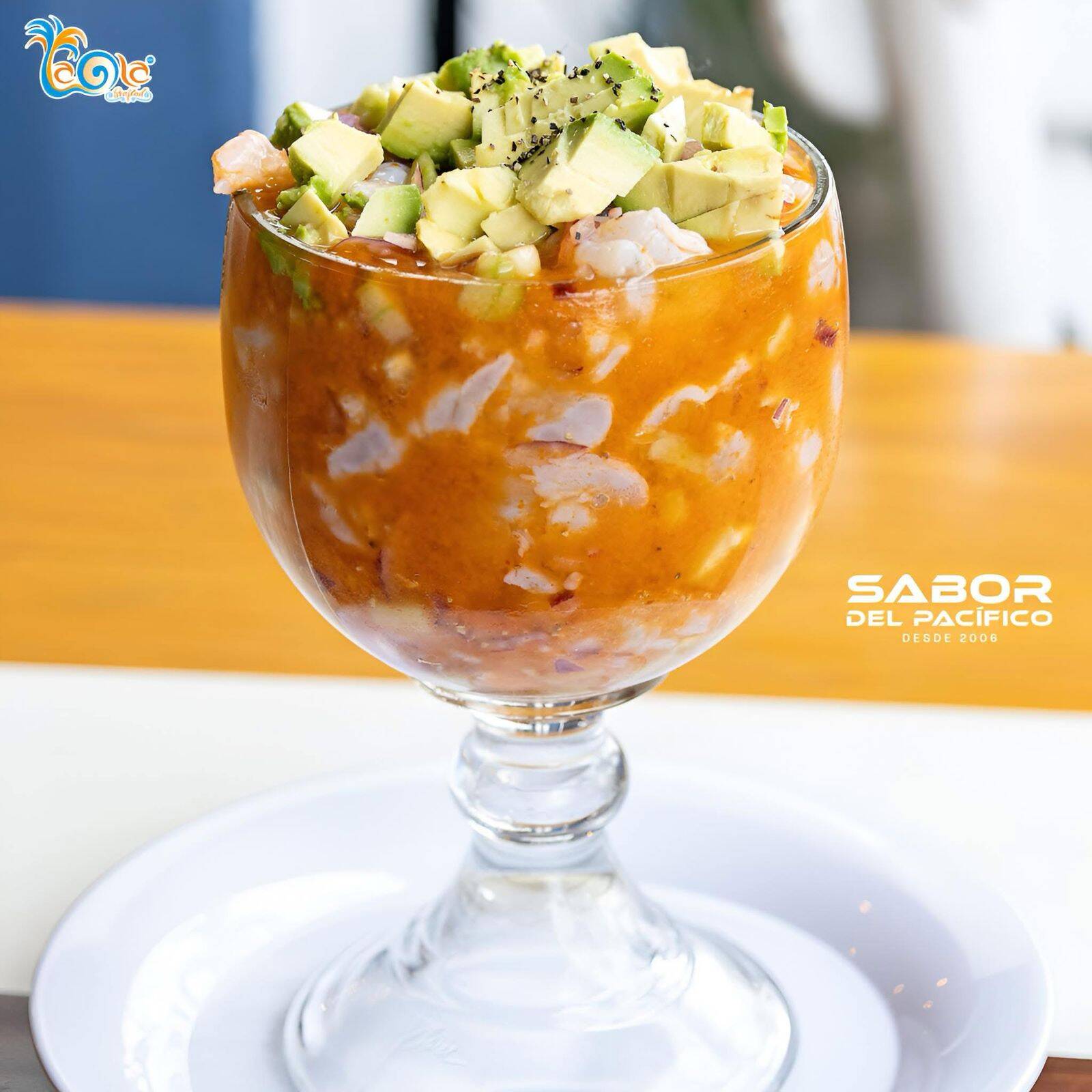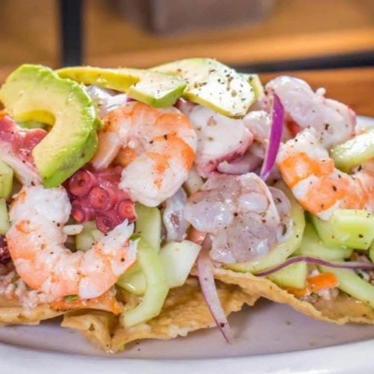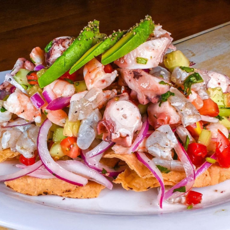 (mezcla de ceviches de camaron cocido, camaron curtido en limon, pulpo, pepino, cebolla y jitomate)