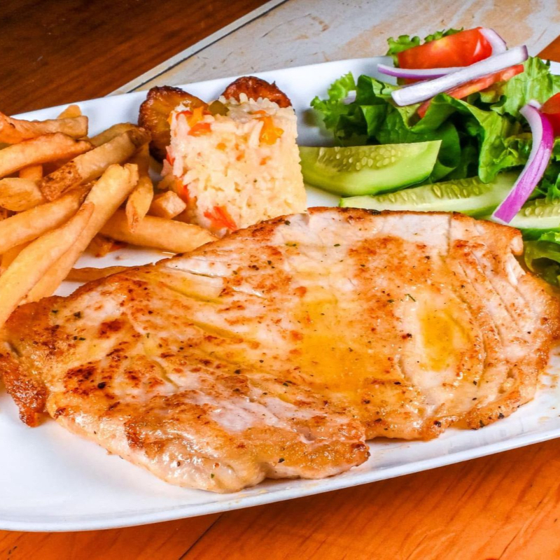 (acompañado de ensalada verde, papas a la francesa, arroz, baguette y platano frito)
