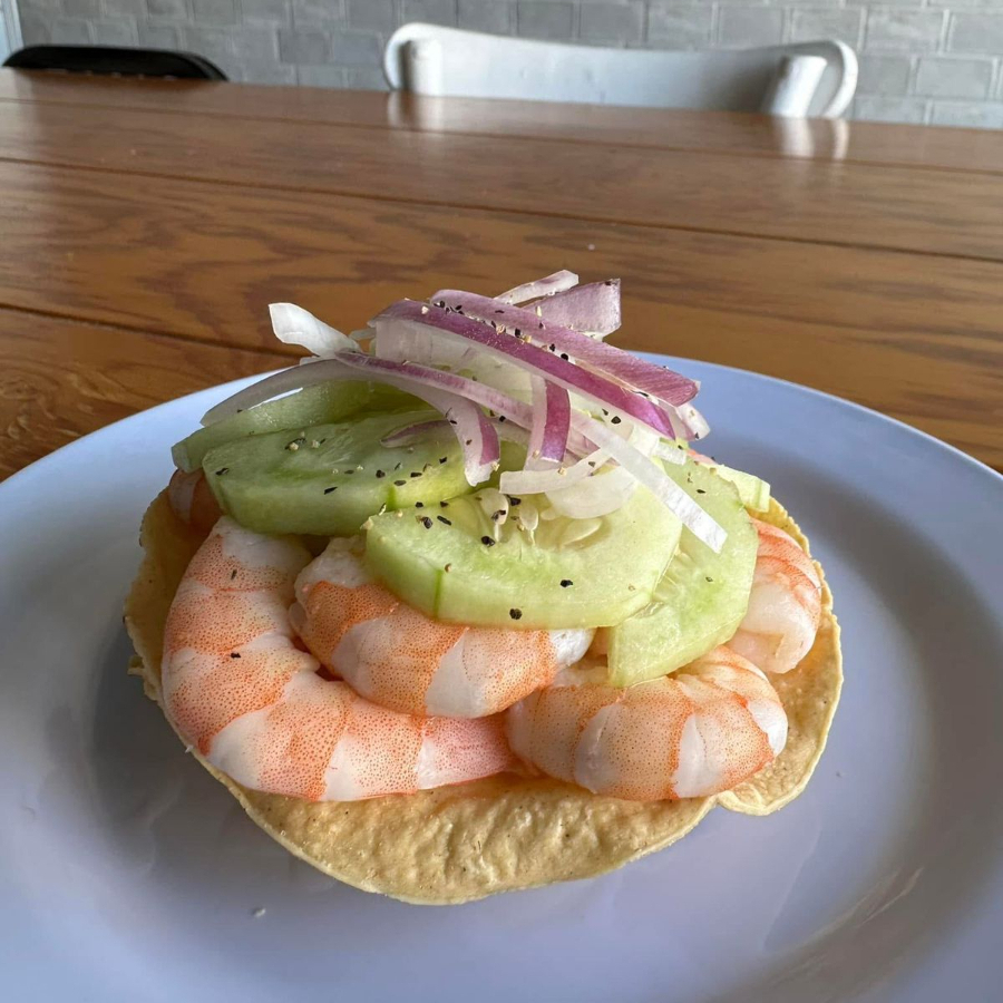 (camarones cocido montados sobre pate de camaron, con pepino y cebolla)