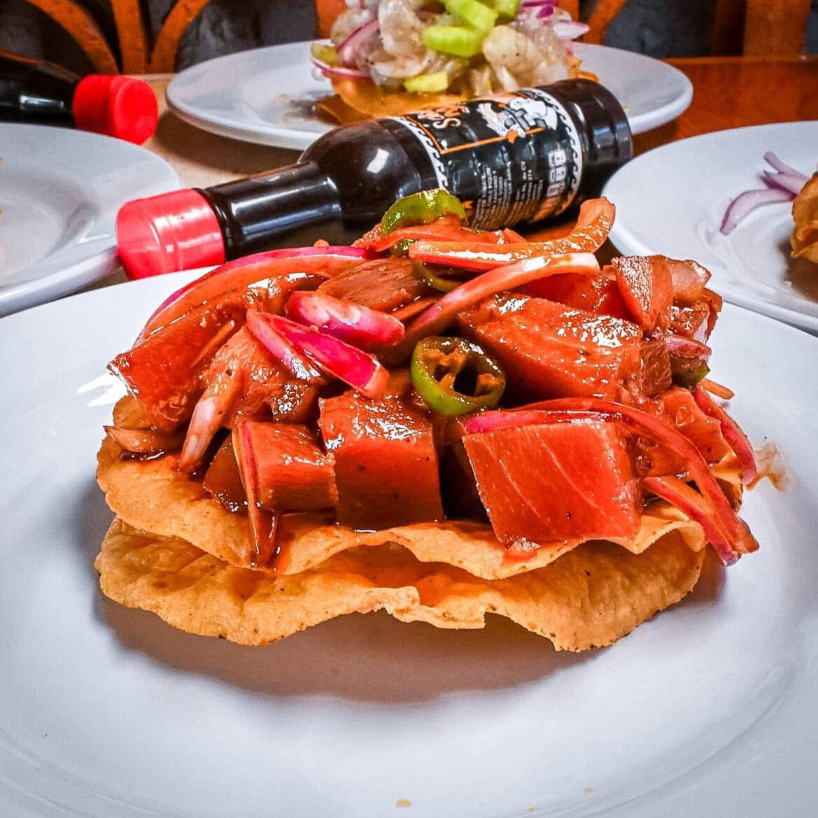 (atun,cebolla,chile serrano en rodajas y salsas negras )