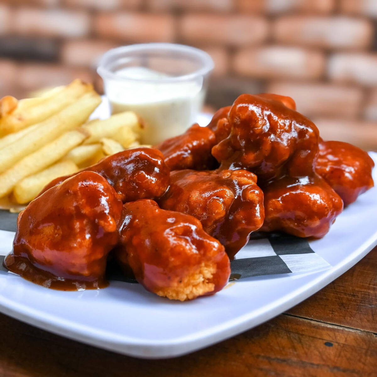 Acompañado de ensalada verde, papas a la francesa, arroz, baguette y platano frito