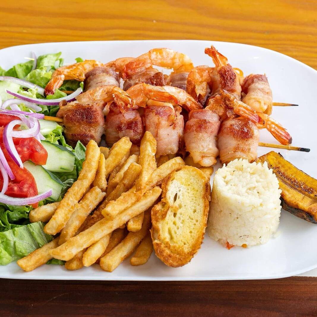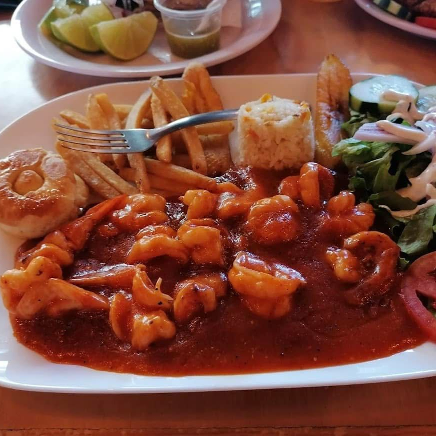( cremosos camarones preparados con una mezcla de philadelphia y queso cheddar acompañado de ensalada verde,papas, arroz, baguette y platano frito)