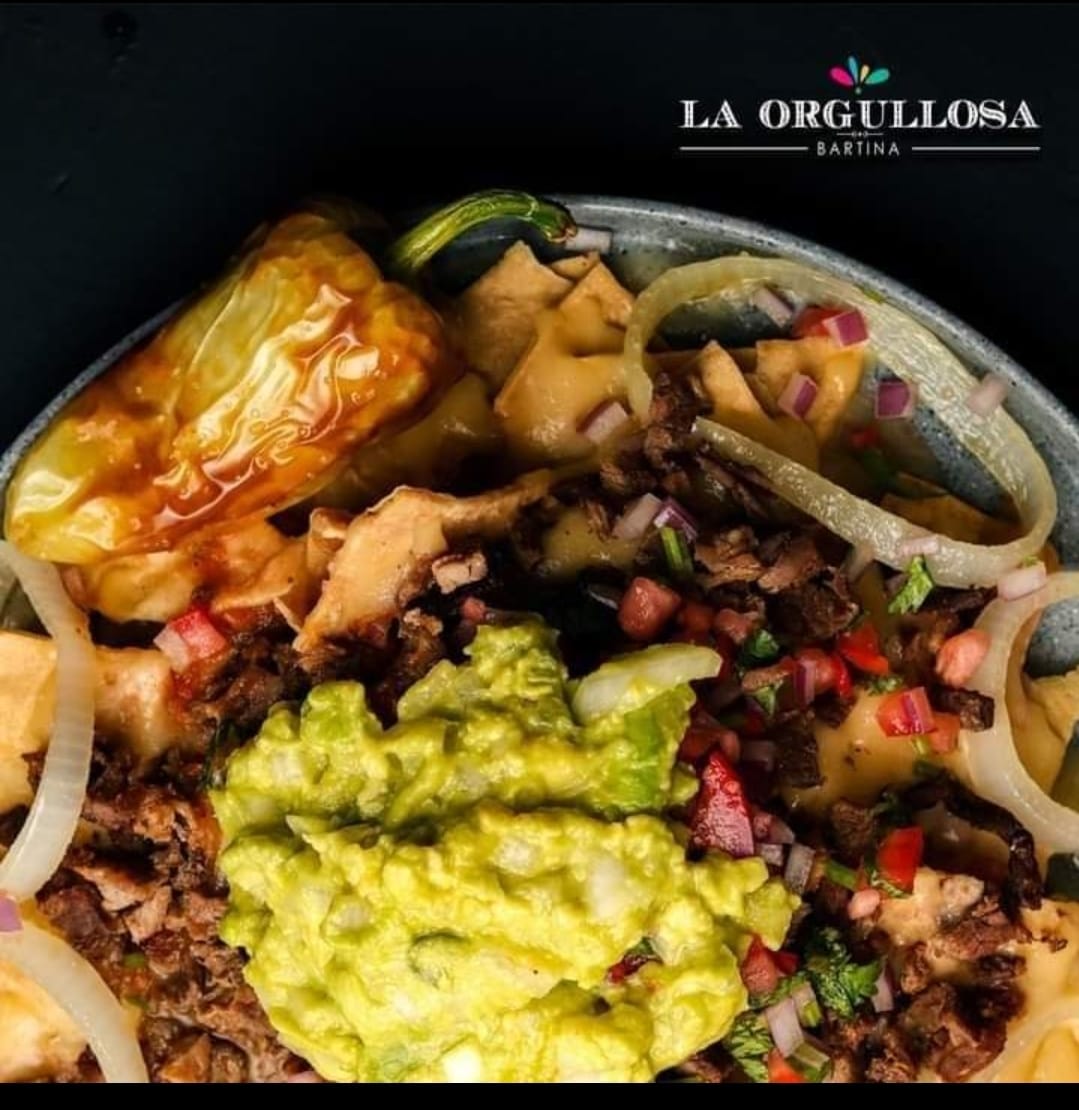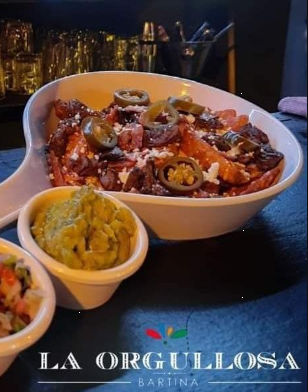 Totopos de maíz bañados en salsa de frijol, queso manchego y queso americano, trocitos de arrachera y tocino. Acompañados de salsa picada, guacamole y salsa asada.