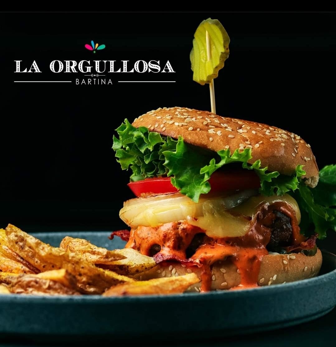 160 g de Carne de res, queso manchego, camarón, aros de cebolla fritos, jitomate y lechuga. Incluyen papas a la francesa, cátsup y jalapeños.